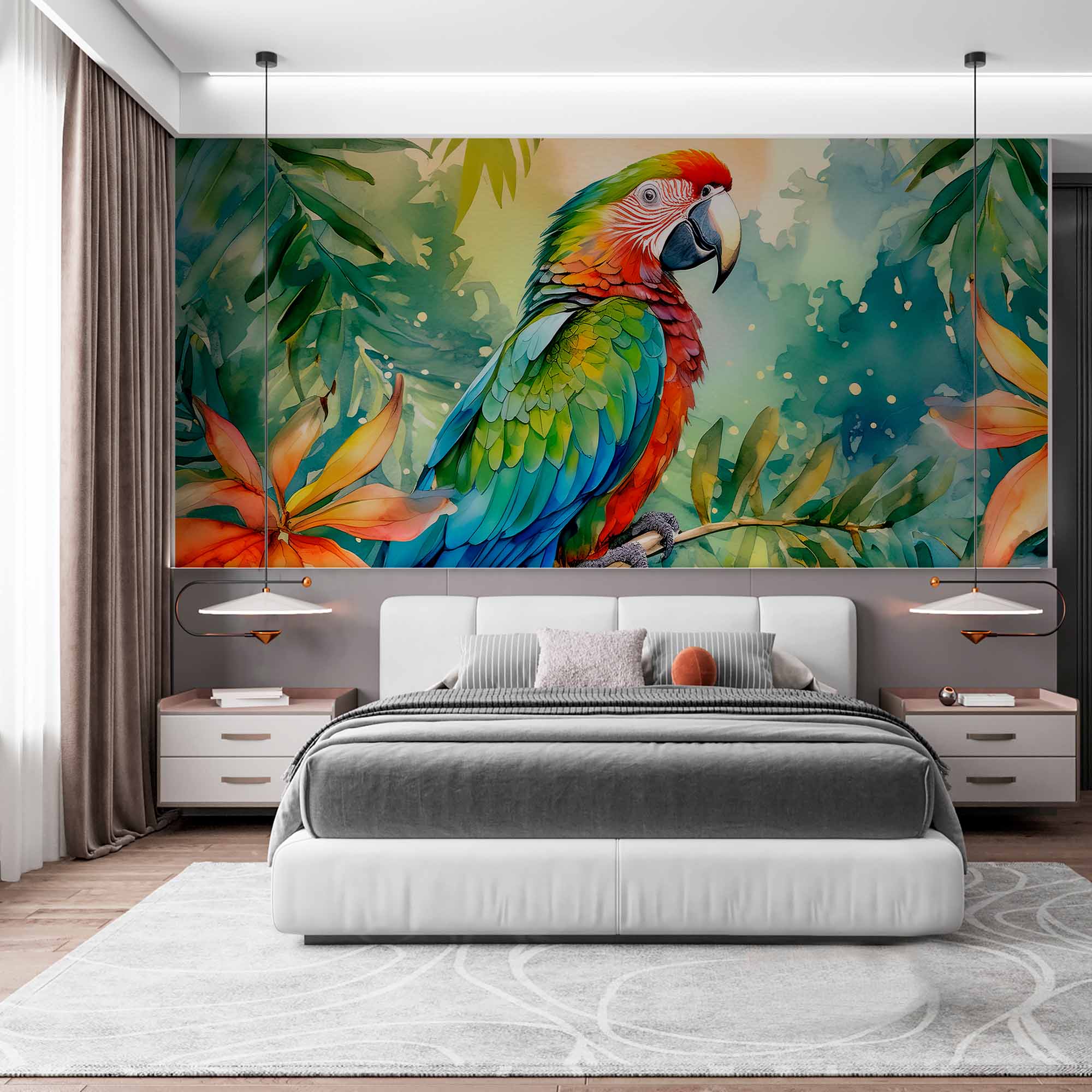 Zdjęcie przedstawia żywą, kolorową papugę siedzącą na gałęzi pośród bujnej tropikalnej roślinności. Pióra papugi stanowią uderzającą mieszankę jasnych zieleni, błękitów, czerwieni i pomarańczy, wyróżniając się na tle bogatych zielonych liści i miękkiego, ciepłego tła. Okoliczne liście zawierają duże liście i kwiaty w odcieniach zieleni, żółci i pomarańczy, co dodaje egzotycznej atmosfery przypominającej dżunglę. Ogólna kompozycja jest żywa i dynamiczna, oddając piękno i żywość tropikalnego środowiska.