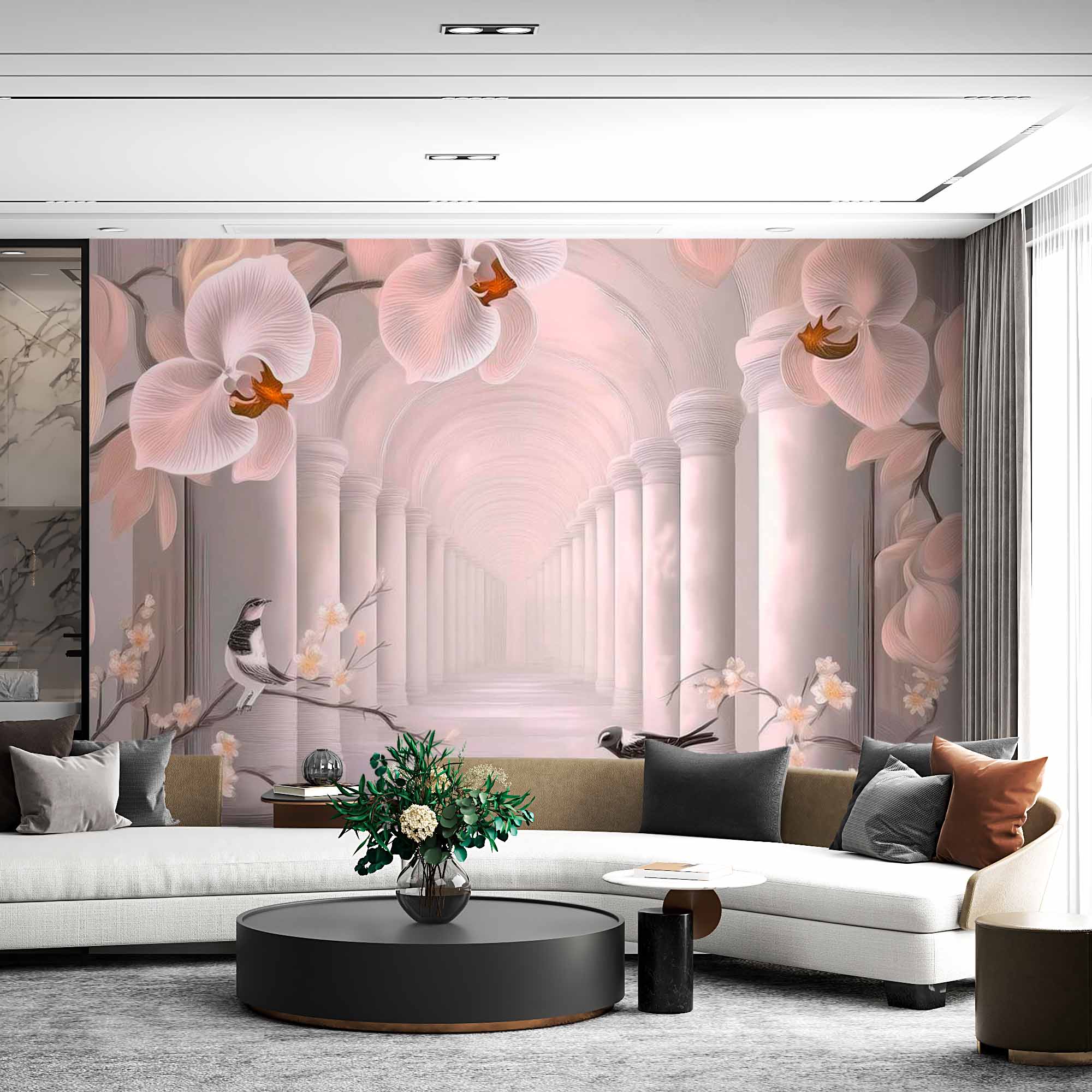 Ta fototapeta przedstawia spokojną i elegancką scenę wielkiego łuku wyłożonego kolumnami, otoczonego miękkimi, delikatnymi orchideami w pastelowych kolorach. Małe ptaki odpoczywają na gałęziach kwitnących kwiatów, dodając spokojnego i naturalnego akcentu tłu architektonicznemu. Delikatna paleta kolorów kremów, różów i stonowanych szarości tworzy uspokajającą i wyrafinowaną atmosferę, idealną do spokojnej przestrzeni.