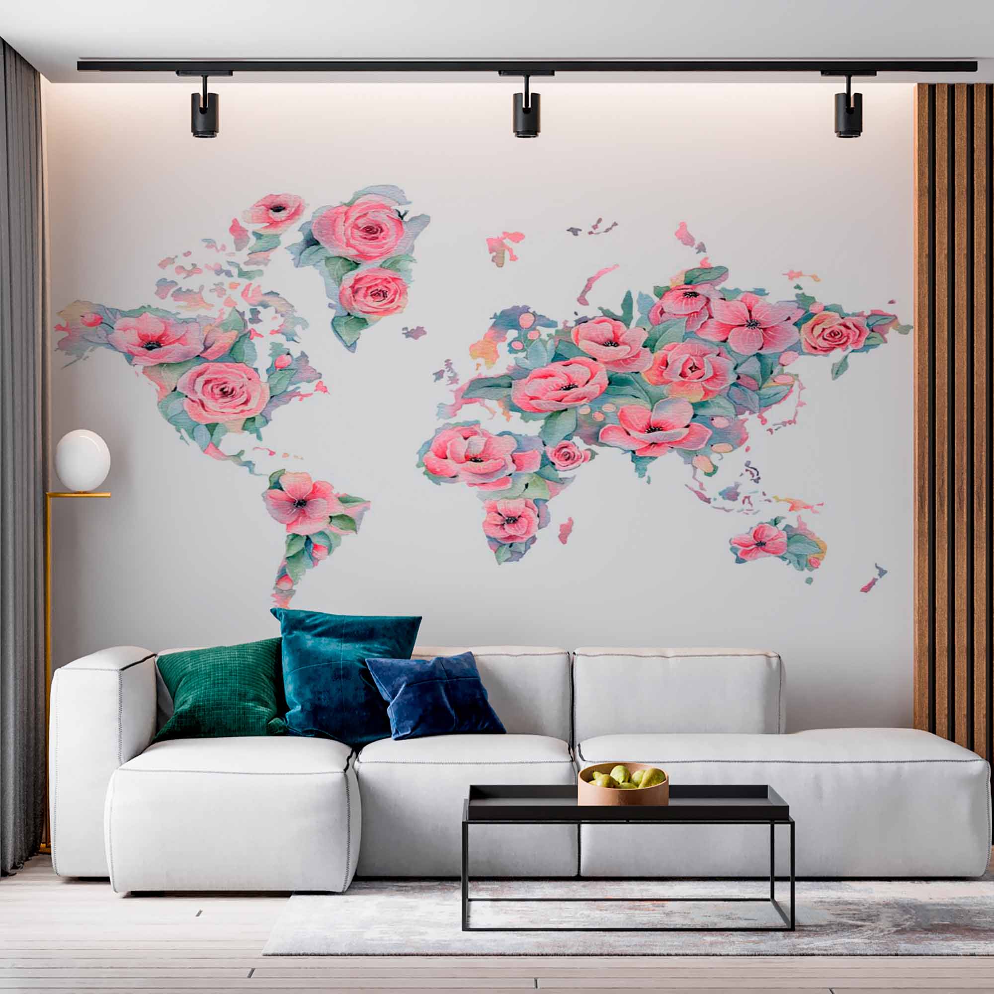 Tapeta ścienna z kwiatową mapą świata z pastelowymi różowymi różami i akwarelą