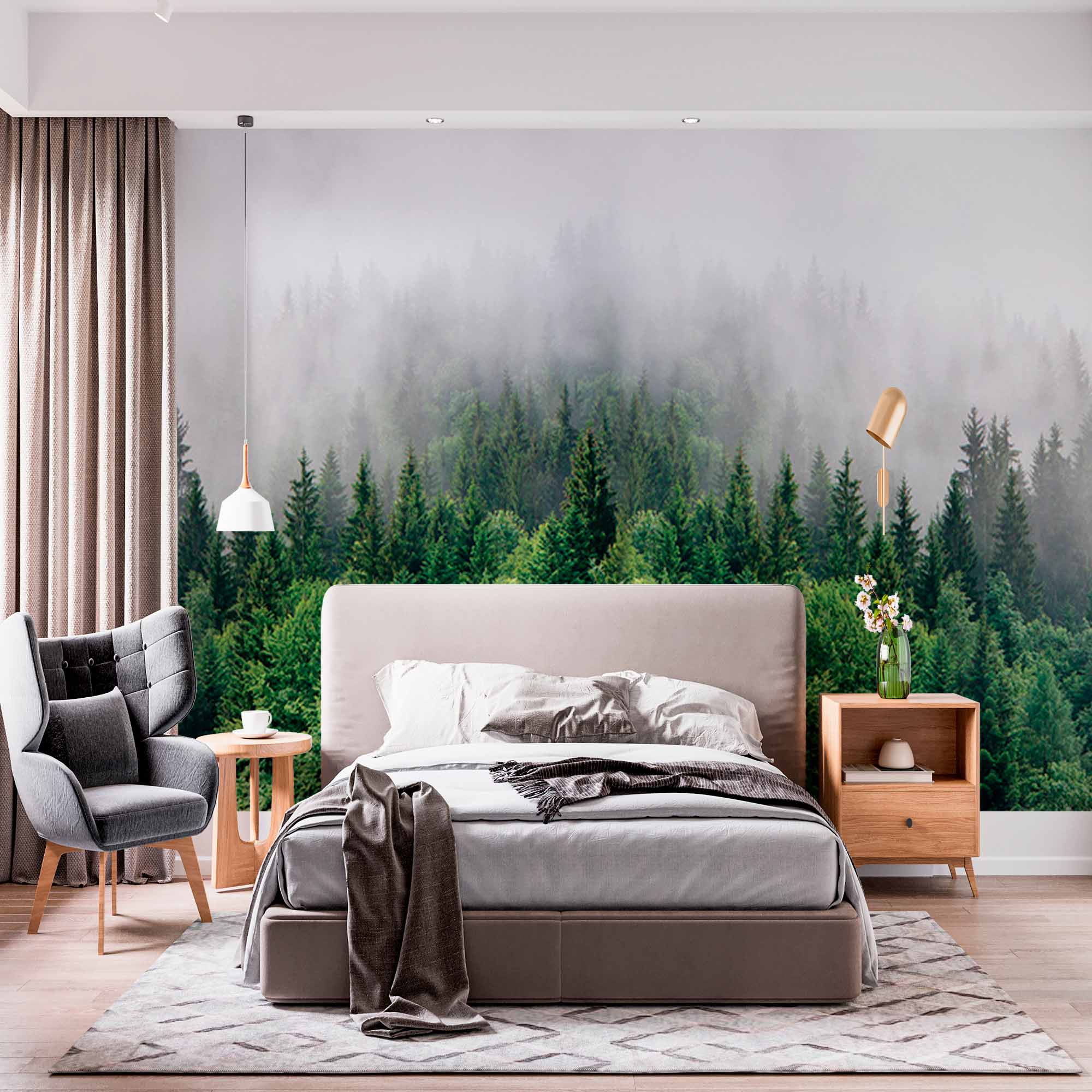 Fototapeta z mglistym, wiecznie zielonym lasem Tapeta z pejzażem drzewnym