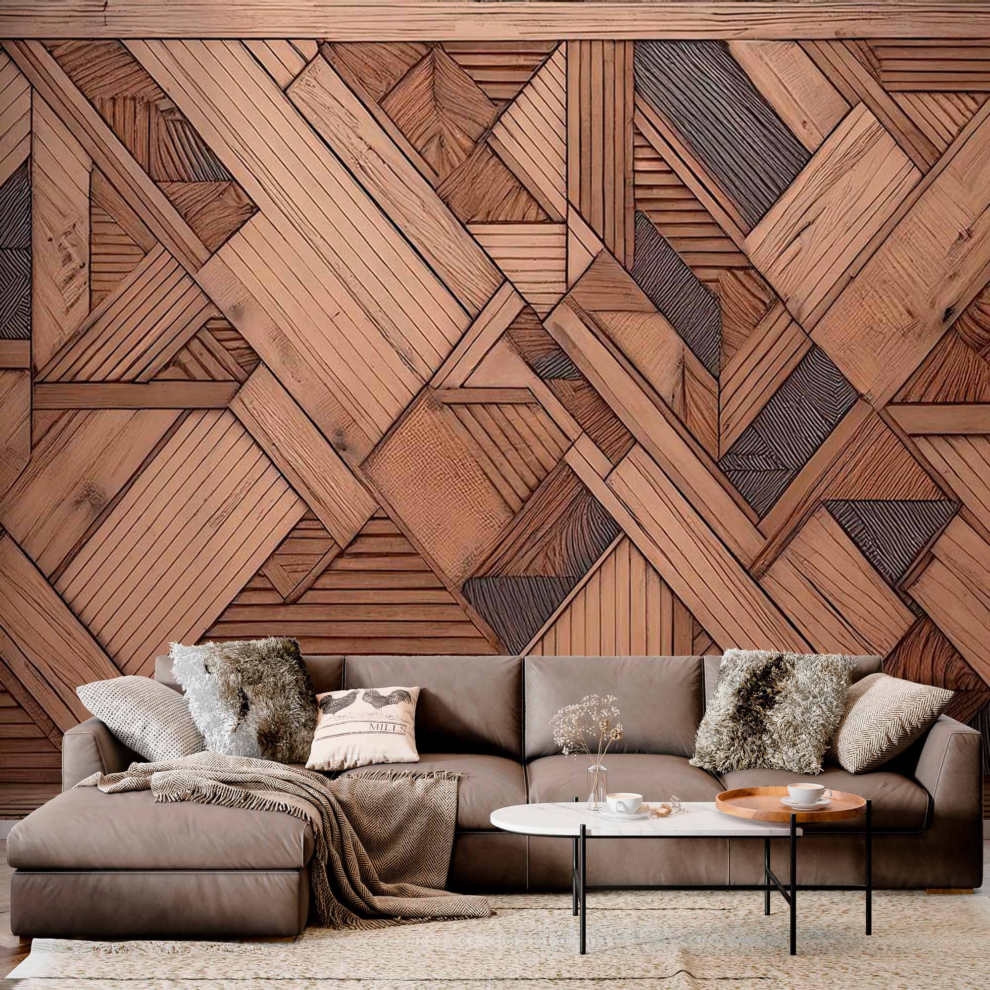 Na zdjęciu fototapeta ze złożonym wzorem geometrycznym złożonym z różnych paneli drewnianych. Projekt łączy w sobie różne tekstury drewna, słoje i odcienie ułożone w kanciaste i liniowe kształty, tworząc skomplikowaną wizualnie mozaikę. Naturalne odcienie drewna, od jasnego do ciemnego brązu, nadają fototapecie rustykalny, a jednocześnie nowoczesny charakter, idealny do dodania ciepłej, organicznej tekstury do wnętrza.