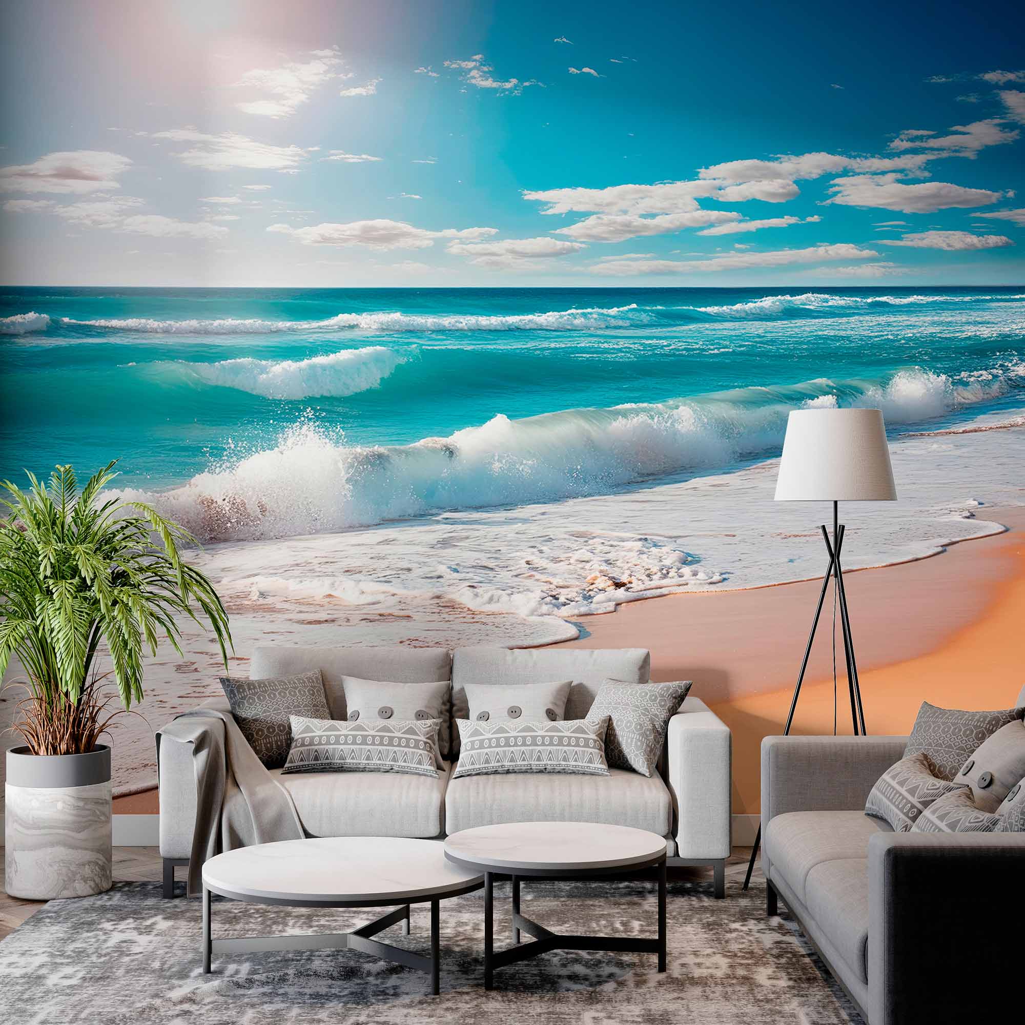 Zdjęcie przedstawia spokojną plażę z miękkimi falami delikatnie toczącymi się po piaszczystym brzegu. Woda ma żywy turkusowy kolor, pięknie kontrastujący z jasnozłotym piaskiem. Niebo jest czyste z kilkoma puszystymi chmurami, a słońce świeci jasno, tworząc spokojną i zachęcającą atmosferę.