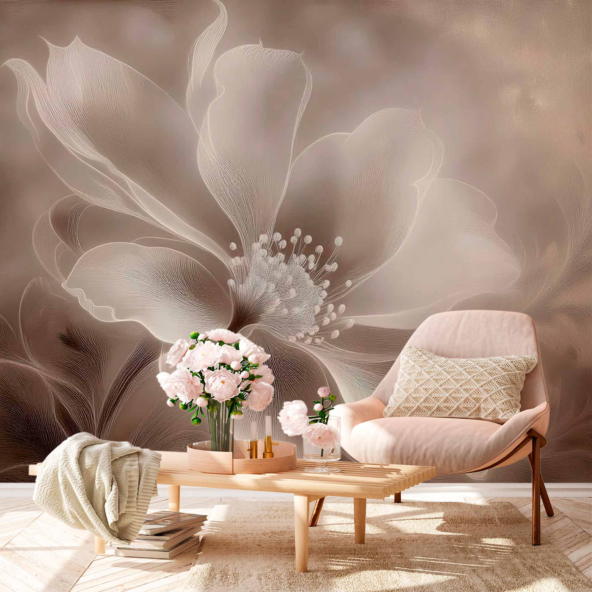 Zdjęcie przedstawia piękny, delikatny kwiatowy wzór tapety w delikatnych odcieniach kości słoniowej i beżu. Centralny kwiat jest duży i misternie szczegółowy, a gładkie, półprzezroczyste płatki nadają mu świetlisty i eteryczny charakter. Delikatne linie i subtelne cieniowanie dodają głębi i tekstury, tworząc pełen wdzięku, płynny wygląd. Tło jest delikatnie zmieszane ze stonowanymi odcieniami beżu, co wzmacnia uspokajającą i spokojną atmosferę. Ogólny efekt to cicha elegancja i spokój, dzięki czemu ta tapeta idealnie nadaje się do stworzenia spokojnej i wyrafinowanej atmosfery w każdym pomieszczeniu.
