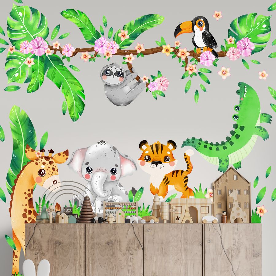 Przygotuj się na wyprawę do dżungli! Starannie zapakowane naklejki są gotowe do napełnienia pokoju dziecka cudami dżungli.