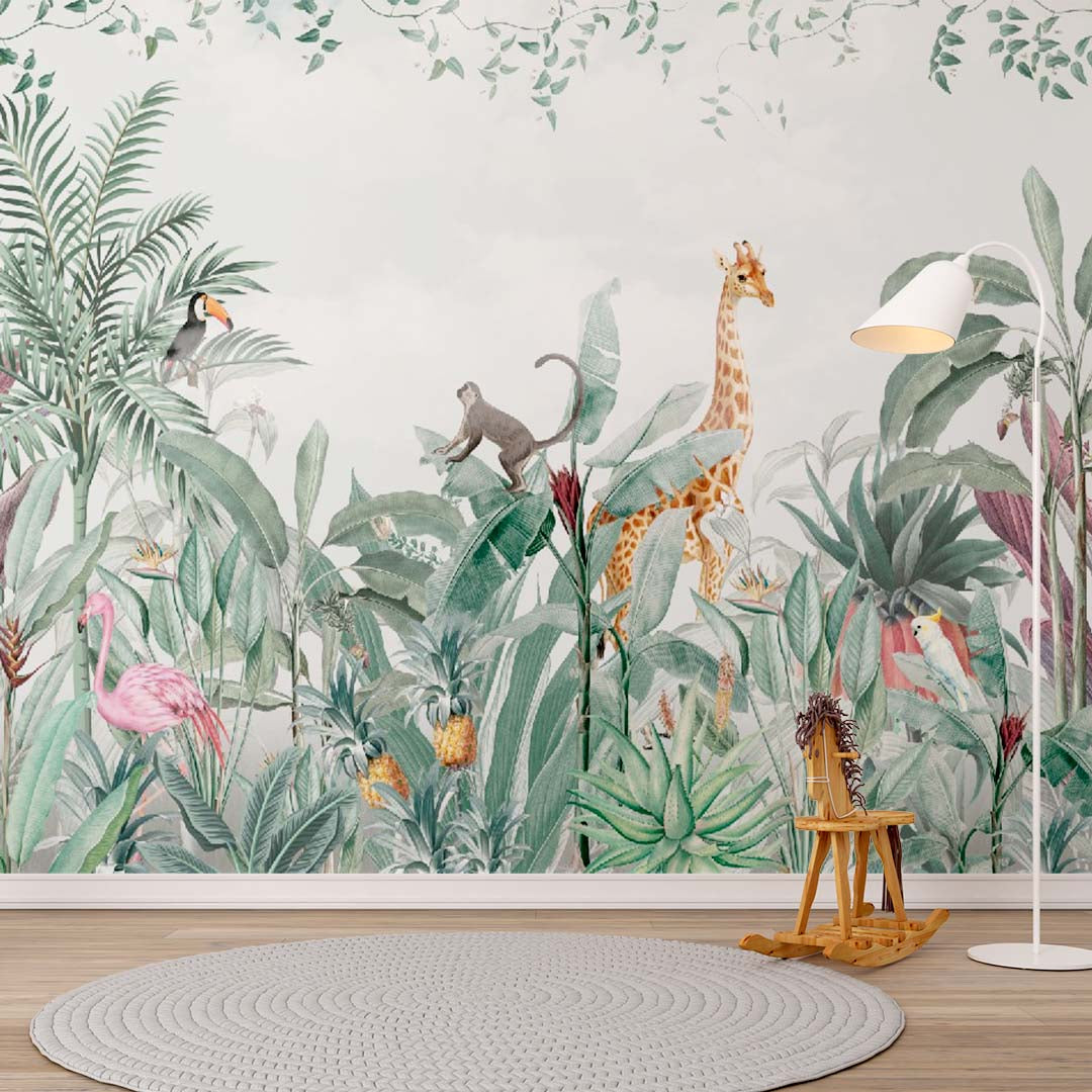 Naklejka dla dzieci Afrykańska dżungla Safari Zwierzęta Tropikalny wzór Tapeta dla dzieci