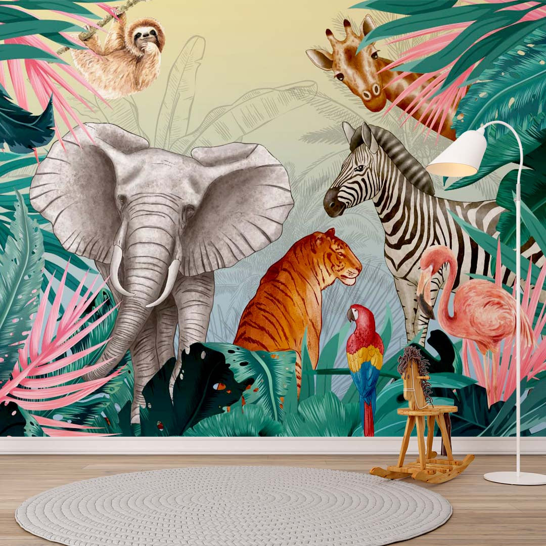 Naklejka dla dzieci Jasne zwierzęta safari Przyciągająca wzrok motyw dżungli Tapeta do pokoju dziecięcego
