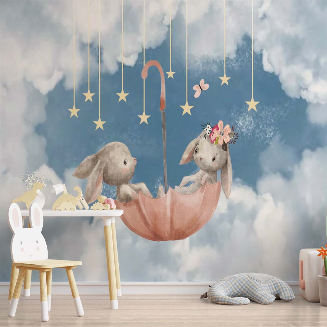 Naklejka dla dzieci Chmury z kreskówek Śliczne króliki z gwiazdami parasolowymi Tapeta do pokoju dziecięcego