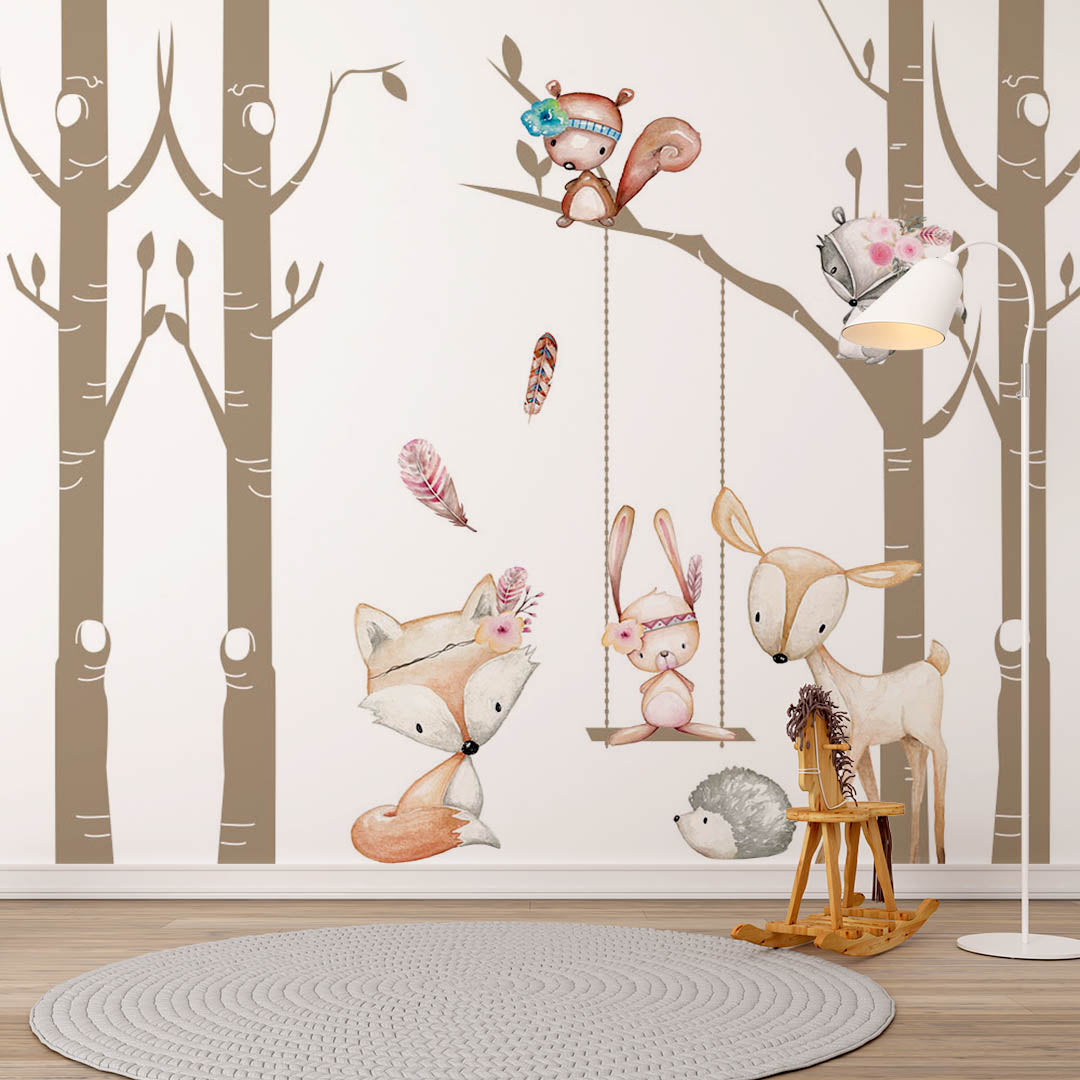 Naklejka dla dzieci Kreskówka zwierzęta leśne na drzewach Minimalna tapeta do pokoju dziecięcego