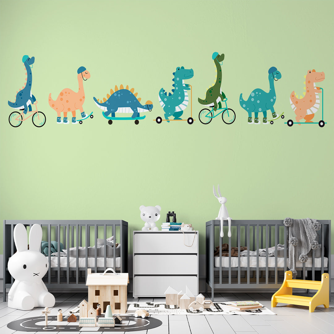 Naklejka dla dzieci Śmieszne dinozaury Zielona tapeta do pokoju dziecięcego