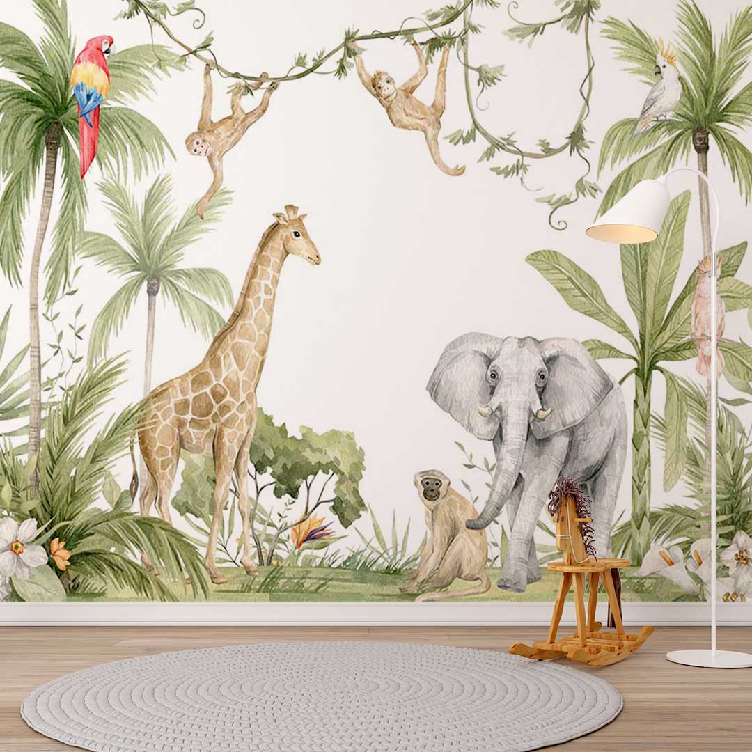Naklejka dla dzieci Dżungla i urocze zwierzęta Liście palmowe Tapeta do pokoju dziecięcego