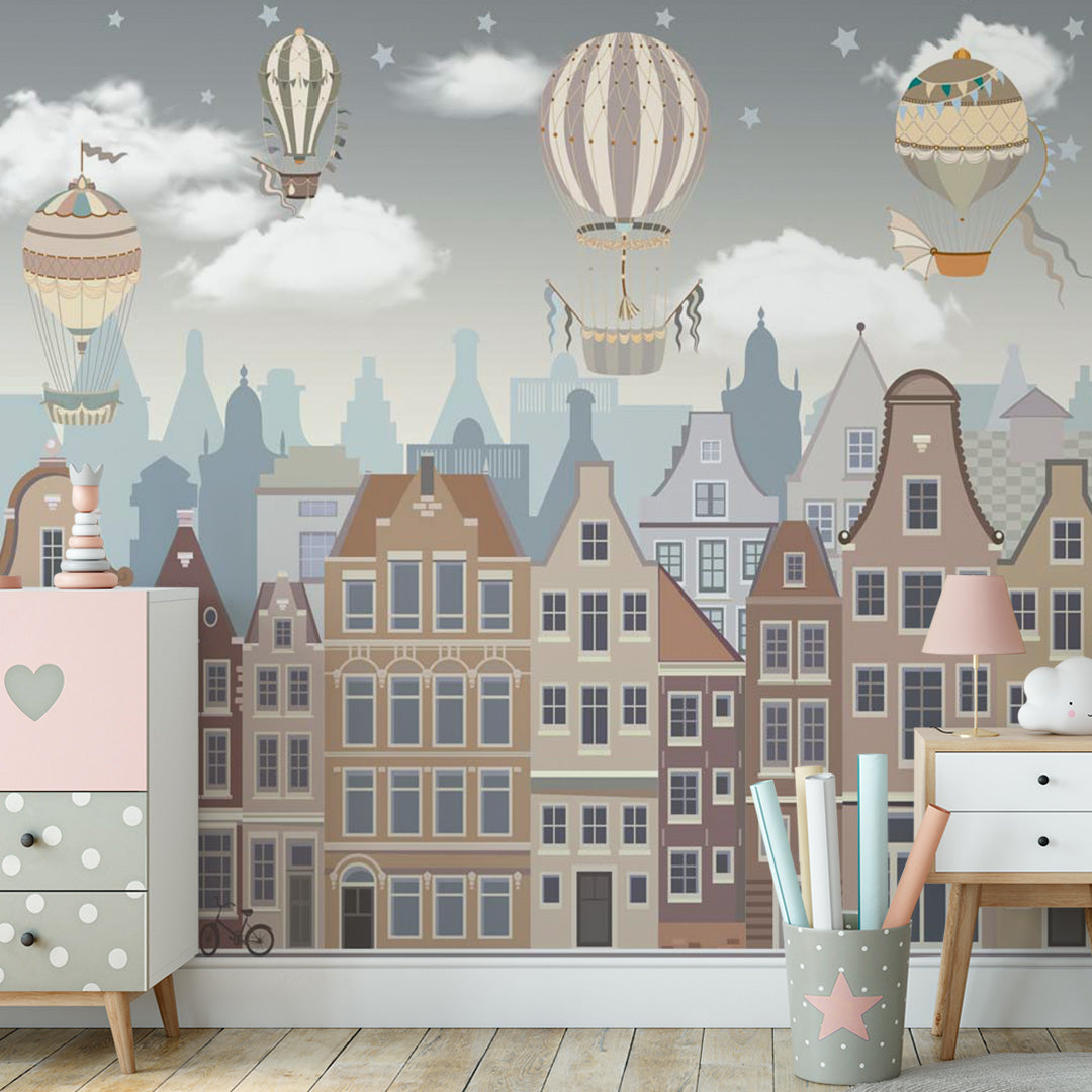 Naklejka dla dzieci Dziecięce miasto z nadrukiem balonów Skandynawska tapeta dla dzieci
