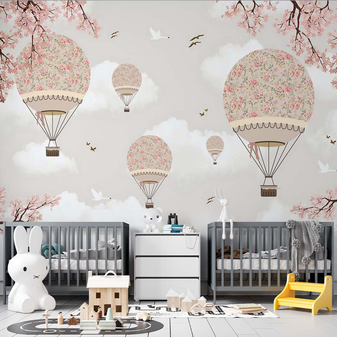 Naklejka dla dzieci Sakura Blossom Balony na ogrzane powietrze Niebo Chmury Wiosna Tapeta dla dzieci