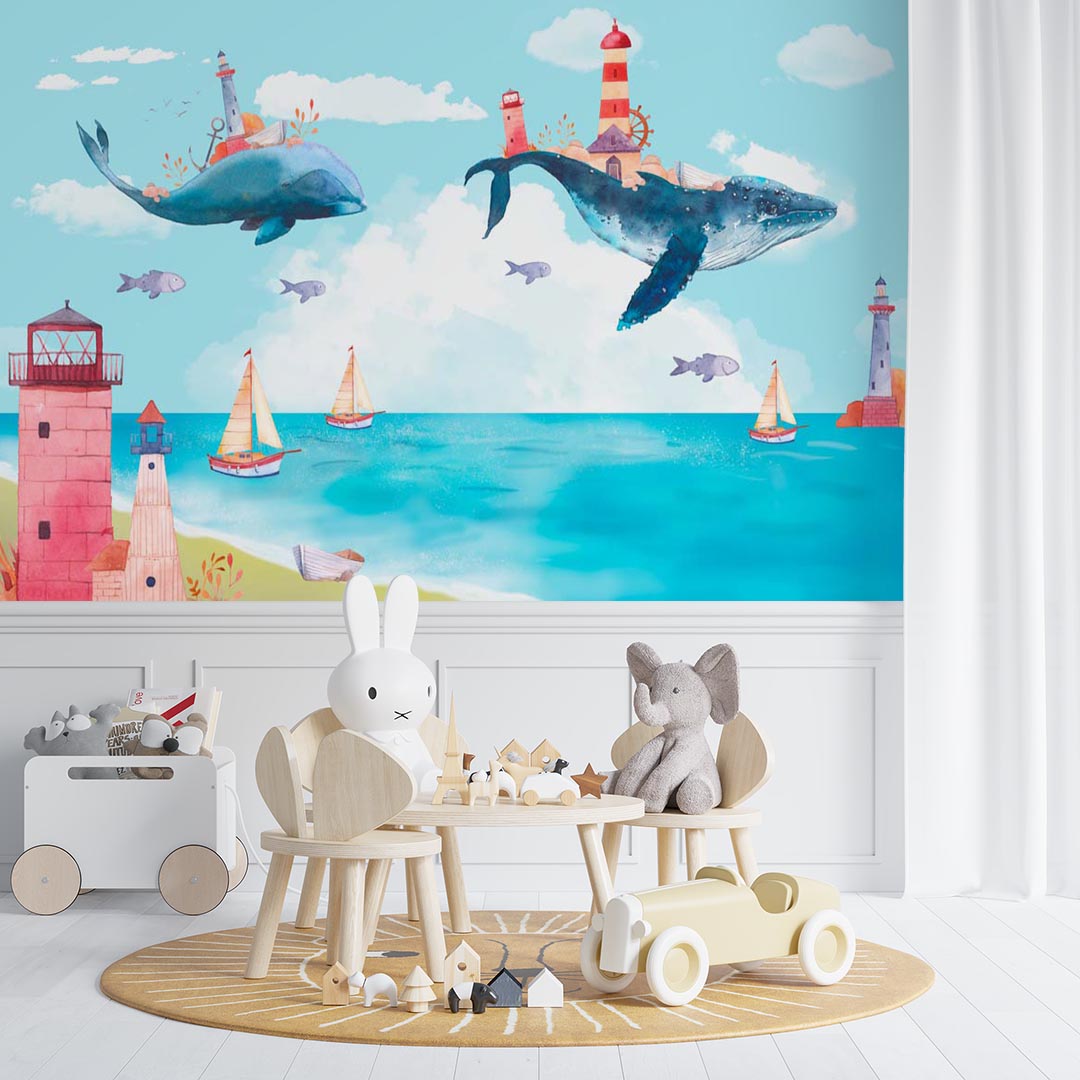 Fototapeta dla dzieci Latający wieloryb nad morzem i latarnia morska na plaży