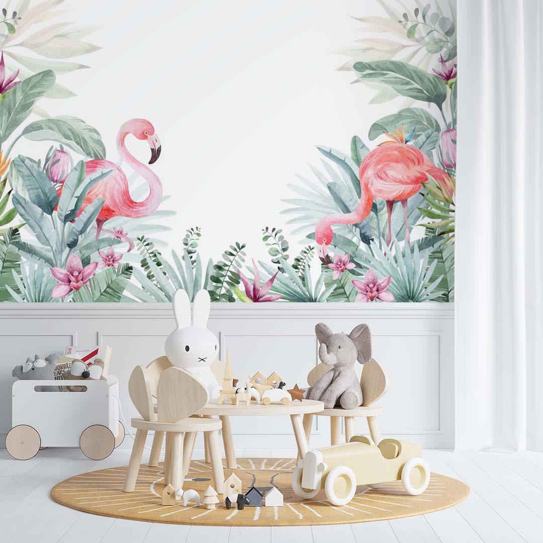 Naklejka dla dzieci Tropikalna tapeta Pink Flamingo do pokoju dziecięcego