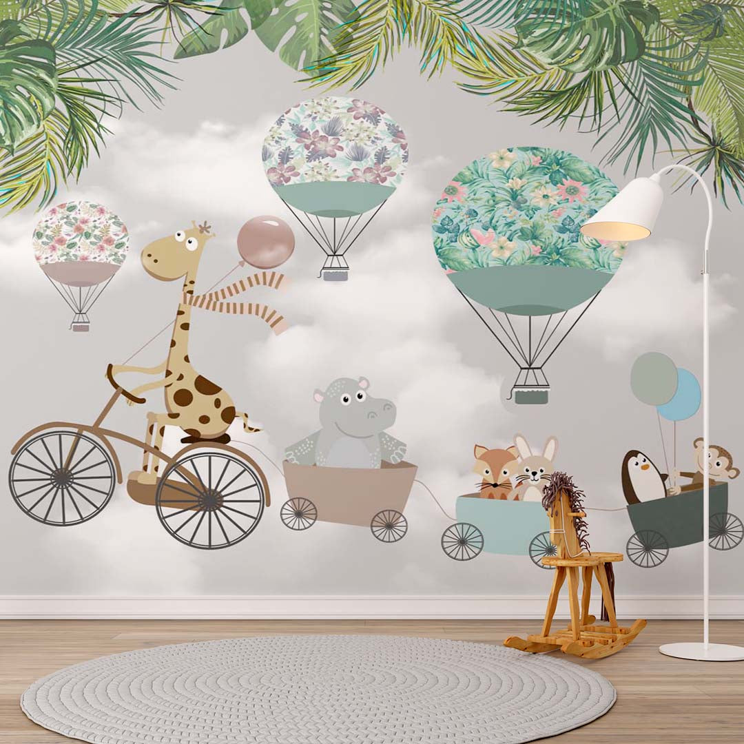 Naklejka dla dzieci Tropikalne liście Śmieszne zwierzęta Balony na ogrzane powietrze Tapeta dla dzieci