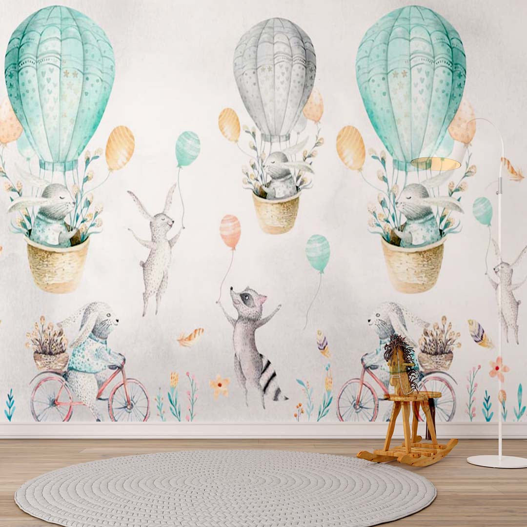 Naklejka dla dzieci Akwarela Zwierzęta leśne Turkusowe zielone balony na ogrzane powietrze Tapeta dla dzieci