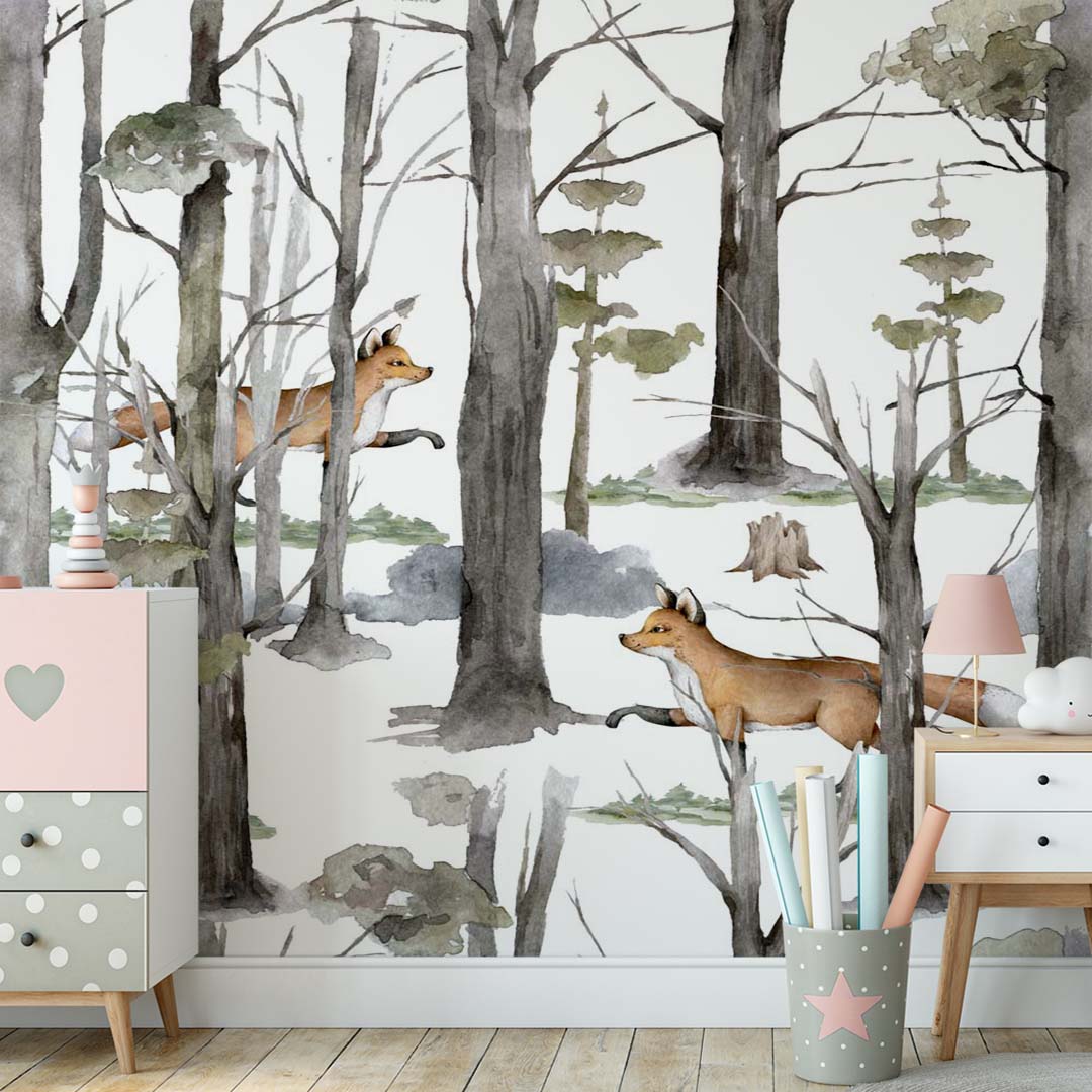 Fototapeta dla dzieci Akwarela zimowy leśny lis Ponadczasowa tapeta do pokoju dziecięcego inspirowana naturą