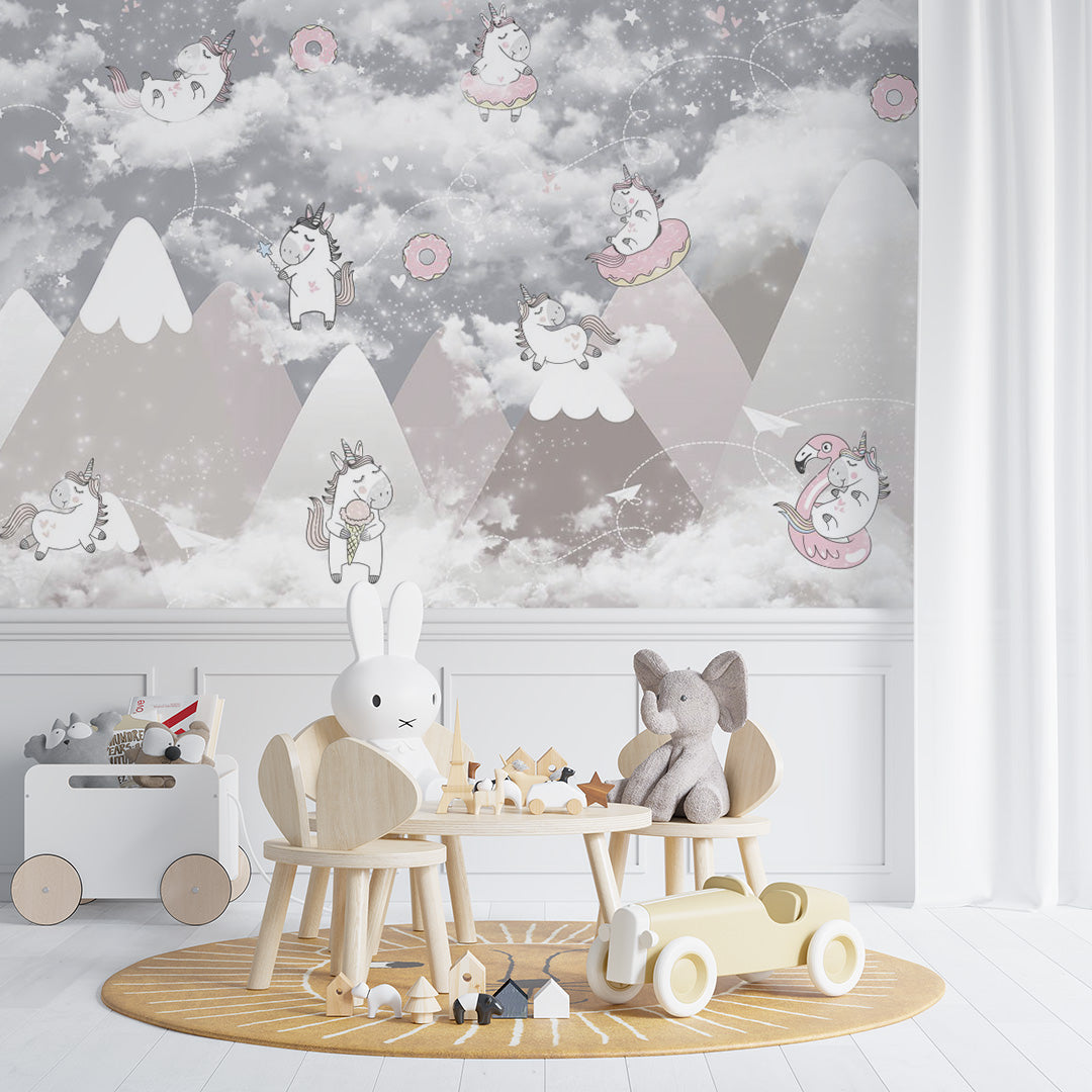 Fototapety dla dzieci Śliczne pączki z jednorożcem Pochmurne góry Tapeta dla dzieci