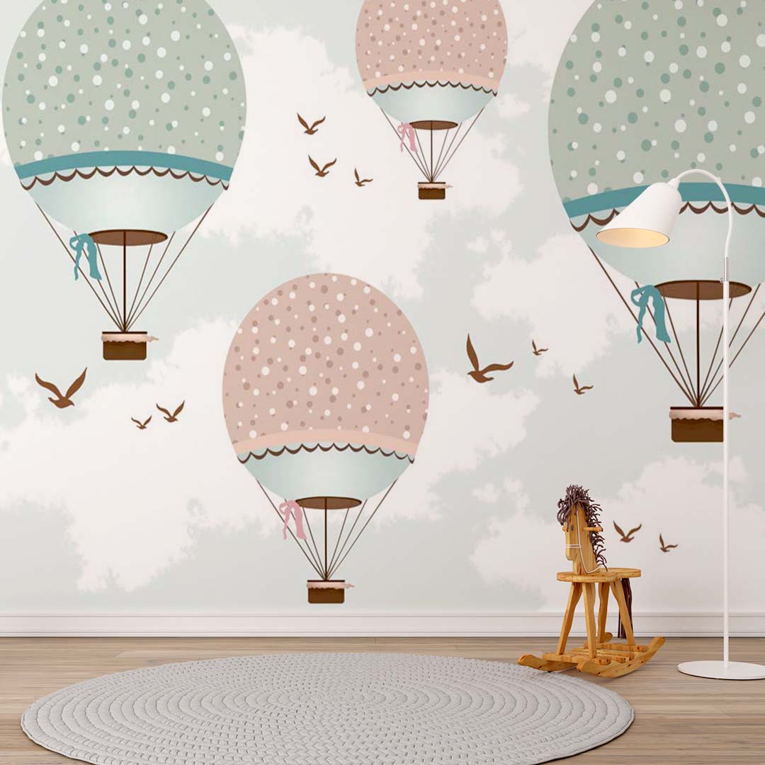 Fototapety dla dzieci Duże balony na ogrzane powietrze Kropki Chmury Samoloty Tapeta dla dzieci