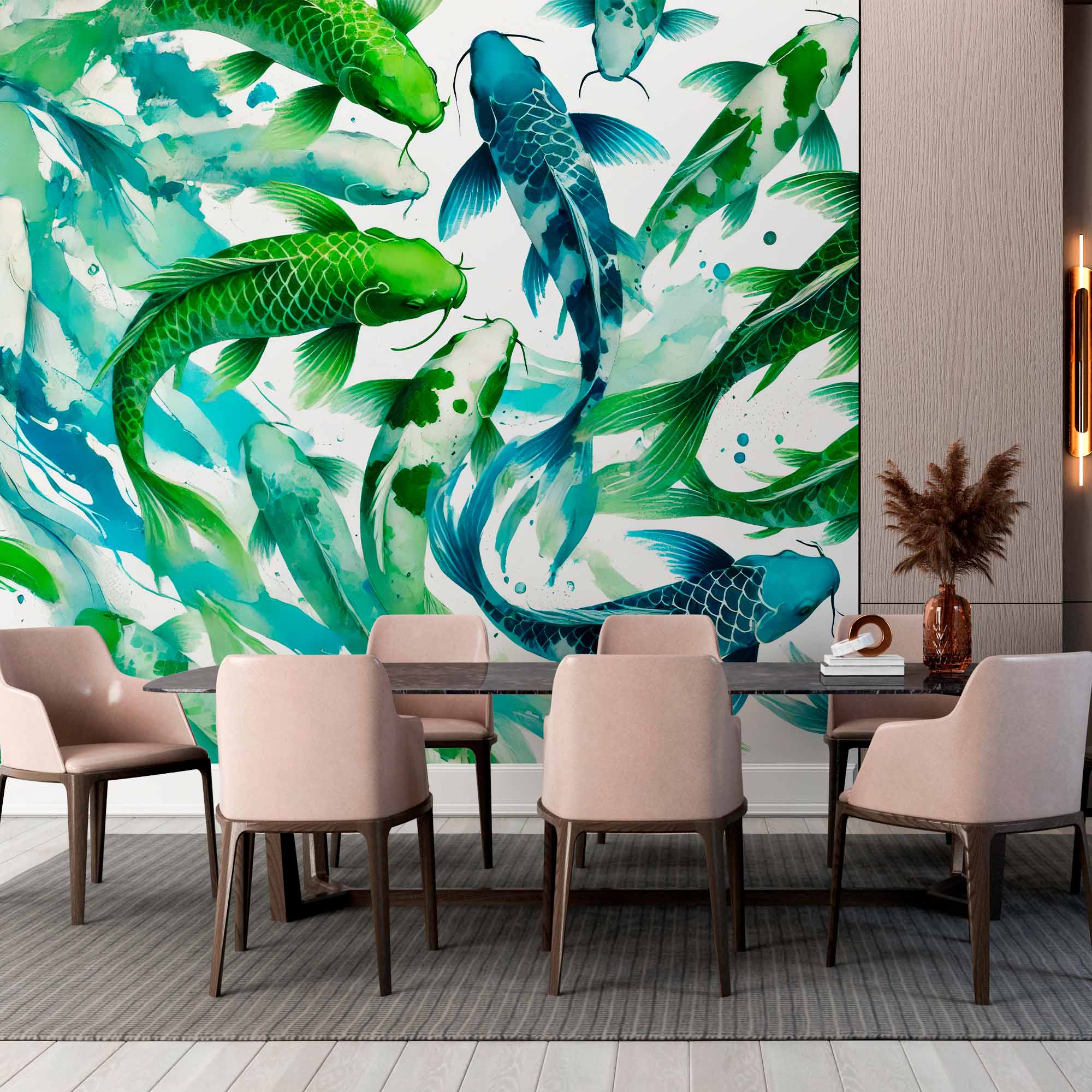 Ten obraz przedstawia żywe i artystyczne przedstawienie ryb koi w różnych odcieniach zieleni i błękitu. Koi z wdziękiem pływają po płótnie, a ich płynne ruchy są uchwycone w akwarelowym stylu. Tło jest mieszanką miękkich, wodnych odcieni, które dodają pogodnej i spokojnej atmosfery sceny. Ta tapeta przywołuje poczucie spokoju i naturalnego piękna, idealna dla tych, którzy cenią życie w wodzie i artystyczne przejawy natury.