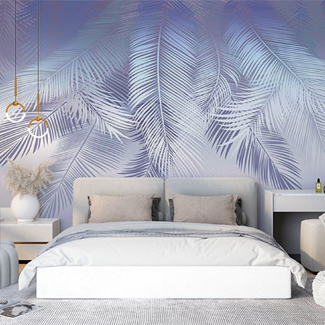 Jasnoniebieska fototapeta botaniczna z gradientowymi liśćmi palmowymi i tropikalną fototapetą