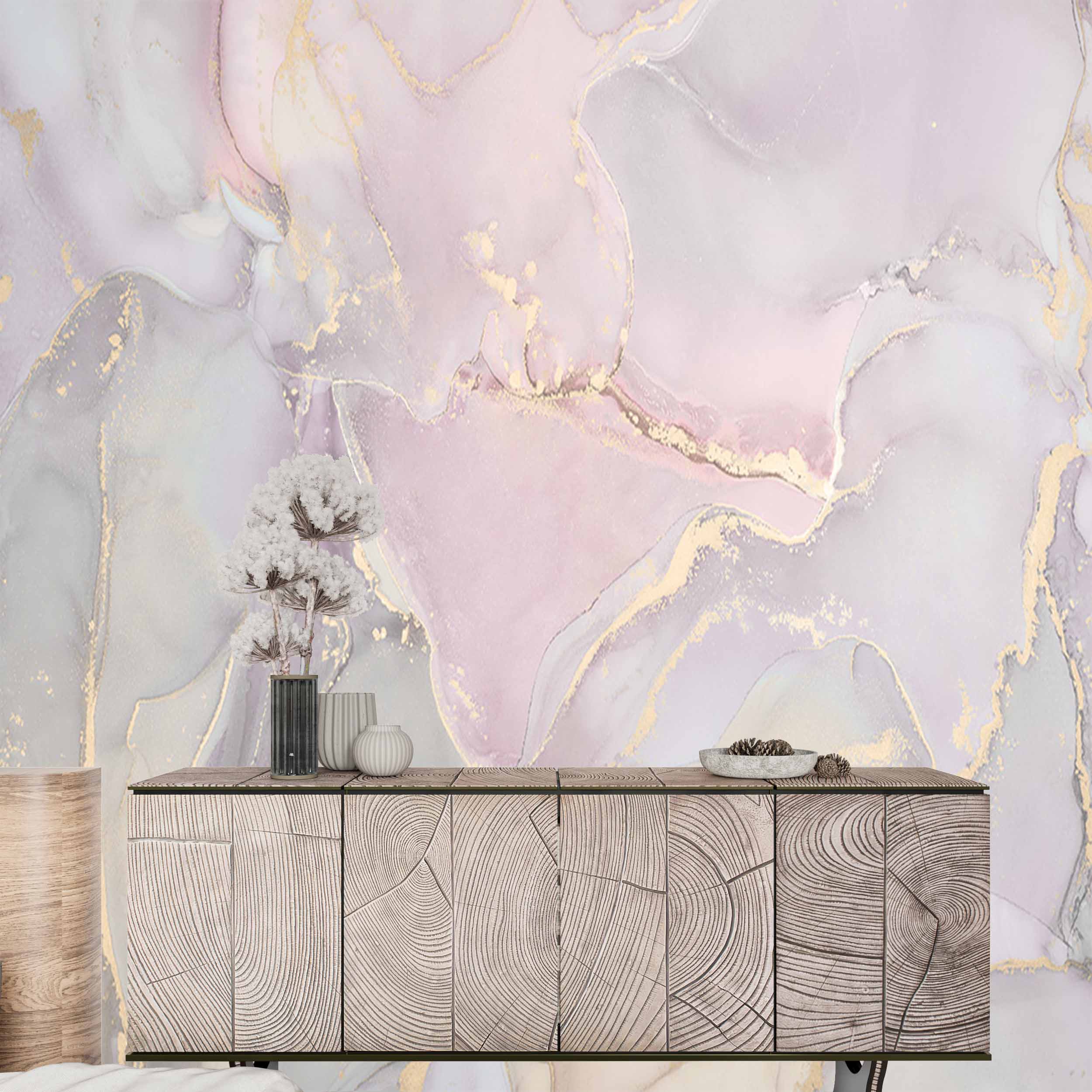 Transform your space with this elegant watercolor-effect wallpaper featuring pastel hues of pink, lavender, and gray, enhanced with shimmering gold accents. Perfect for creating a serene and luxurious ambiance in bedrooms, living rooms, or creative workspaces.