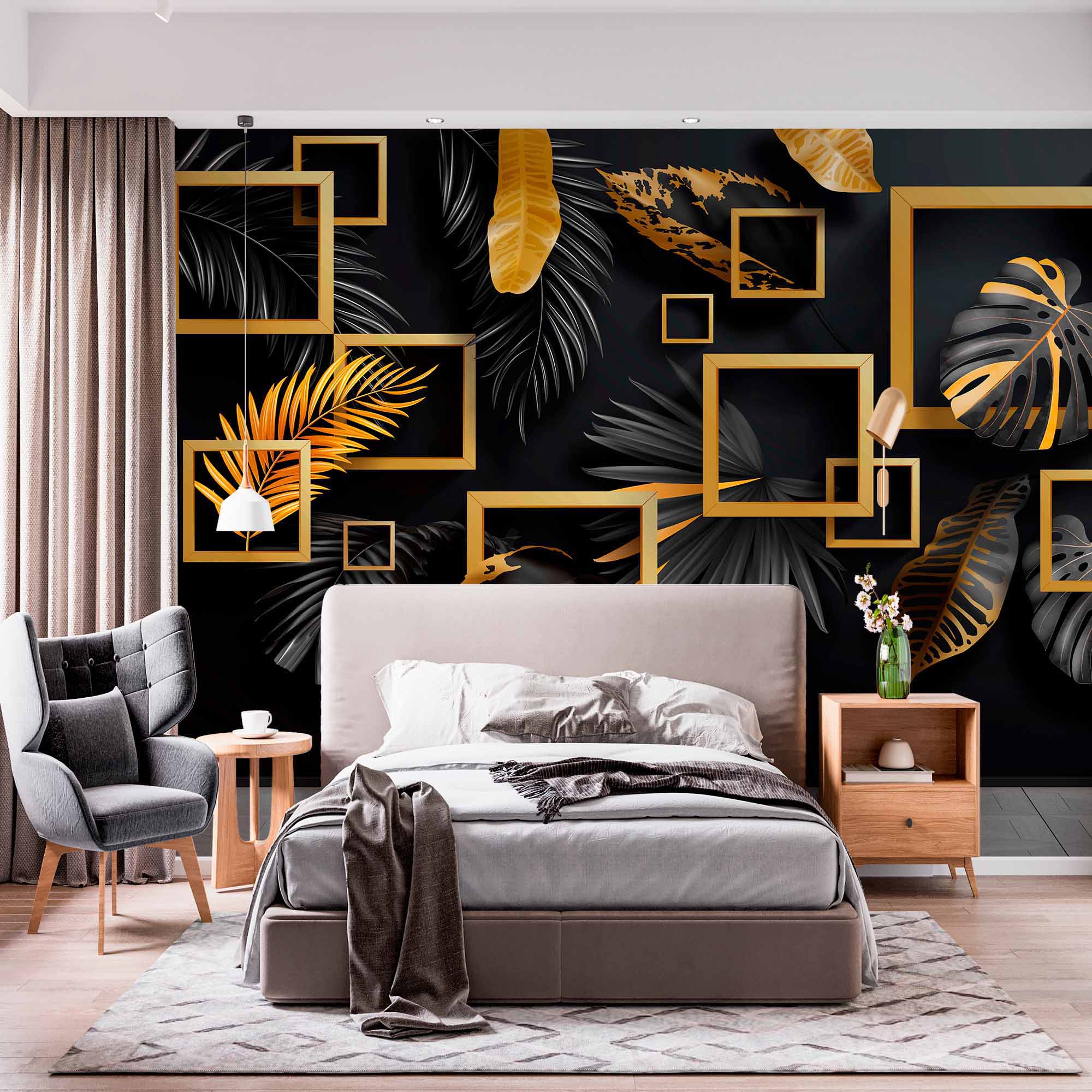 Ten obraz przedstawia luksusowy wzór tapety z efektownym połączeniem czerni i złota. Projekt zawiera różnorodne tropikalne liście w odcieniach matowej czerni i błyszczącego złota, ułożone w artystyczny wzór. Złote ramki o różnych rozmiarach unoszą się wokół liści, tworząc wrażenie głębi i wymiaru. Ciemne tło pięknie kontrastuje ze złotymi akcentami, nadając całej kompozycji wyrafinowany i efektowny charakter. Ta tapeta idealnie nadaje się do stworzenia odważnej, nowoczesnej i eleganckiej przestrzeni wewnętrznej.