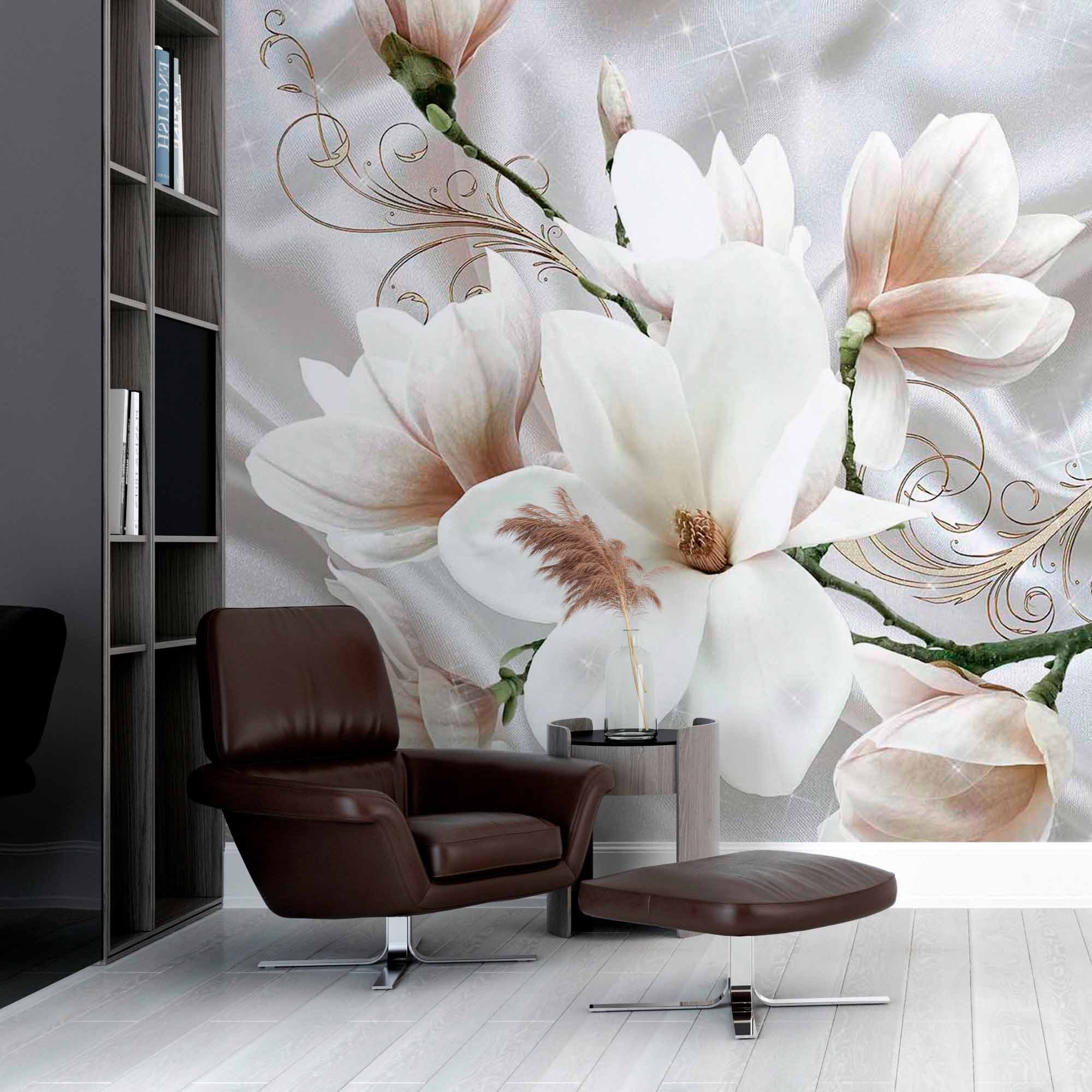 Obraz przedstawia luksusową fototapetę przedstawiającą kwiaty magnolii w pełnym rozkwicie na połyskującym, jedwabistym tle. Delikatne białe płatki magnolii wyróżniają się, akcentowane delikatnymi beżowymi odcieniami, a wdzięczne złote wiry i subtelne iskierki dodają atmosfery elegancji. Ten wyrafinowany projekt tworzy wyrafinowaną i marzycielską atmosferę, idealną do dodania odrobiny luksusu każdej przestrzeni.