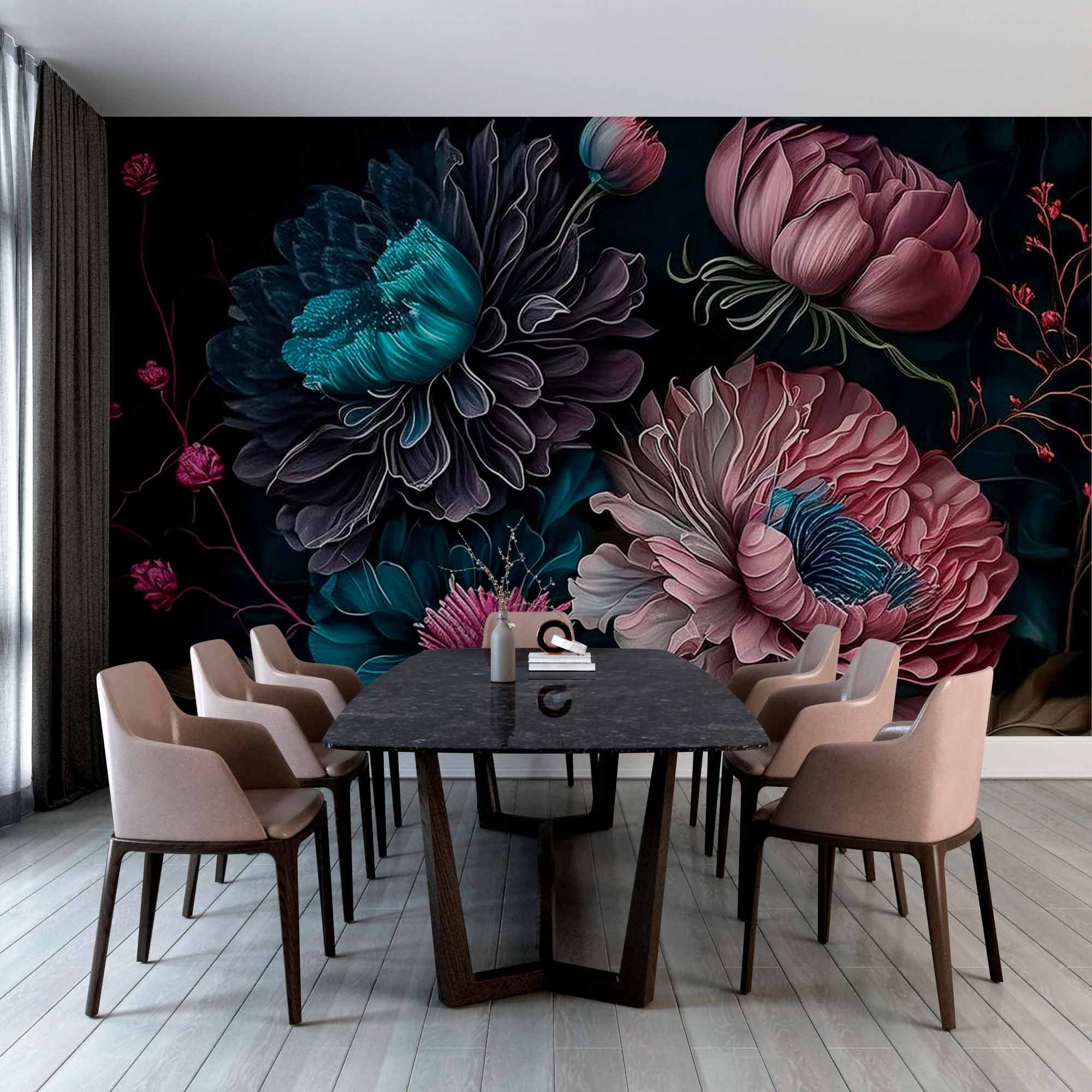 Ta tapeta przedstawia dramatyczny i luksusowy kwiatowy wzór, z dużymi, bujnymi kwiatami w bogatych, klejnotowych kolorach, takich jak głęboki turkus, zakurzony róż i żywa magenta. Kwiaty są misternie szczegółowe, z warstwowymi płatkami, które wydają się wyłaniać z ciemnego, prawie czarnego tła, tworząc uderzający kontrast, który przyciąga wzrok. Delikatne akcenty jasnoróżowych pąków oraz subtelna gra światła i cienia dodają głębi i wymiaru kompozycji, sprawiając, że kwiaty wydają się niemal trójwymiarowe. Otaczające liście w stonowanych odcieniach ziemi dodatkowo podkreślają elegancję i wyrafinowanie projektu. Ta tapeta idealnie nadaje się do dodania odrobiny śmiałości i blasku każdej przestrzeni, tworząc atmosferę tajemniczości i bogactwa.