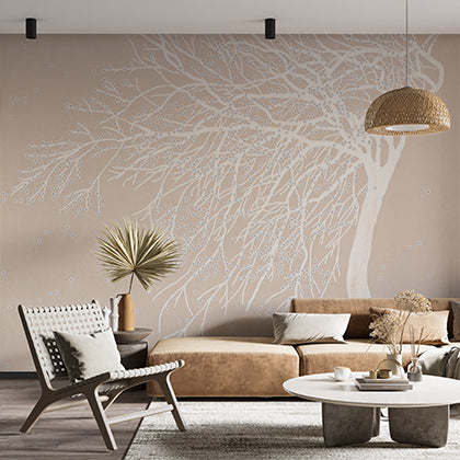 Minimalistyczna fototapeta drzewo Beżowe tło z tapetą z białą gałązką