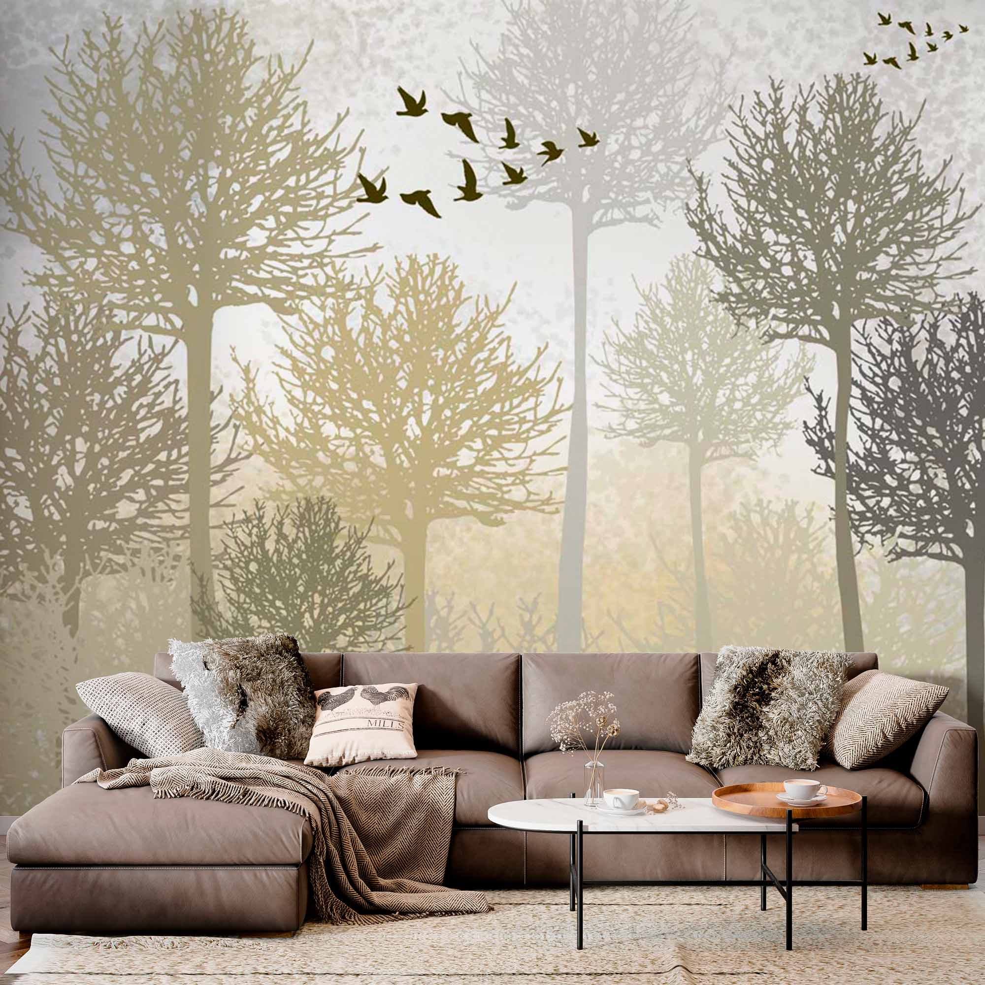 Tapeta Mglisty Złoty Las ze szybującymi ptakami