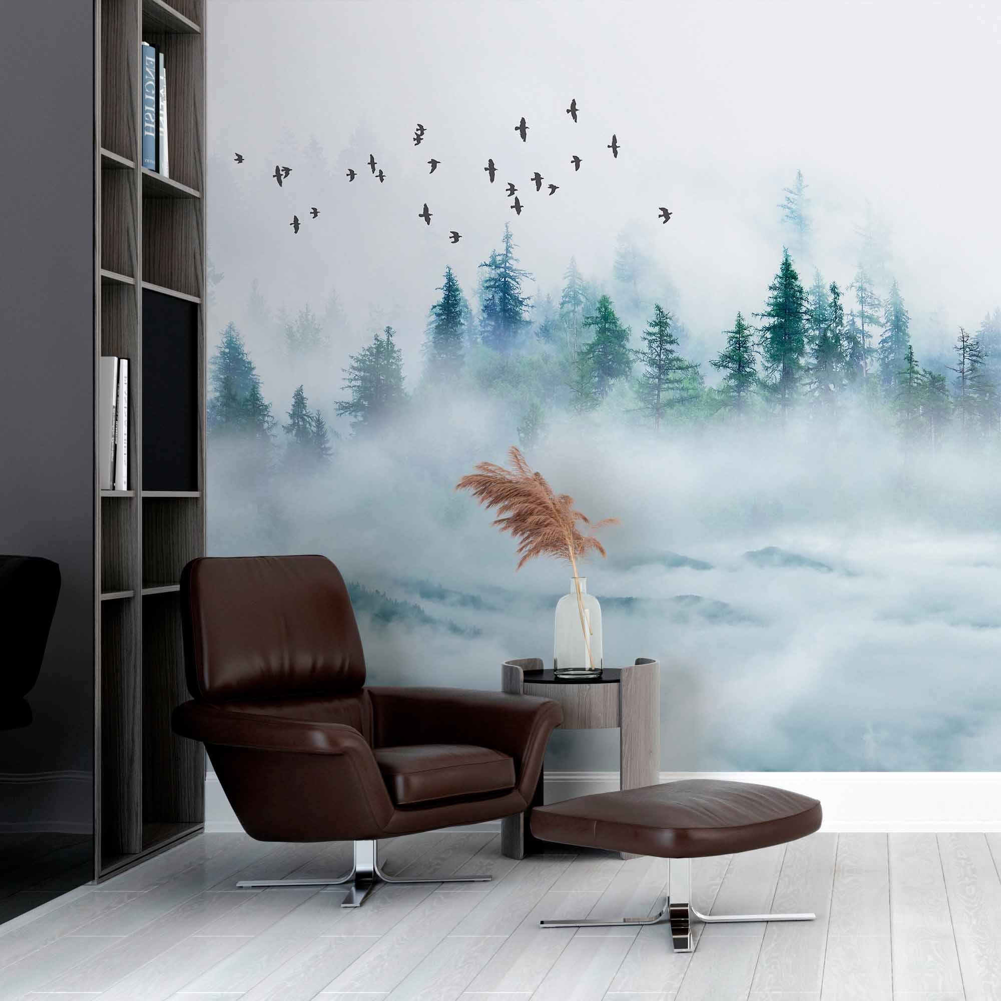 Tapeta na wymiar Mglisty górski las - Czarująca mgła z szybującymi ptakami