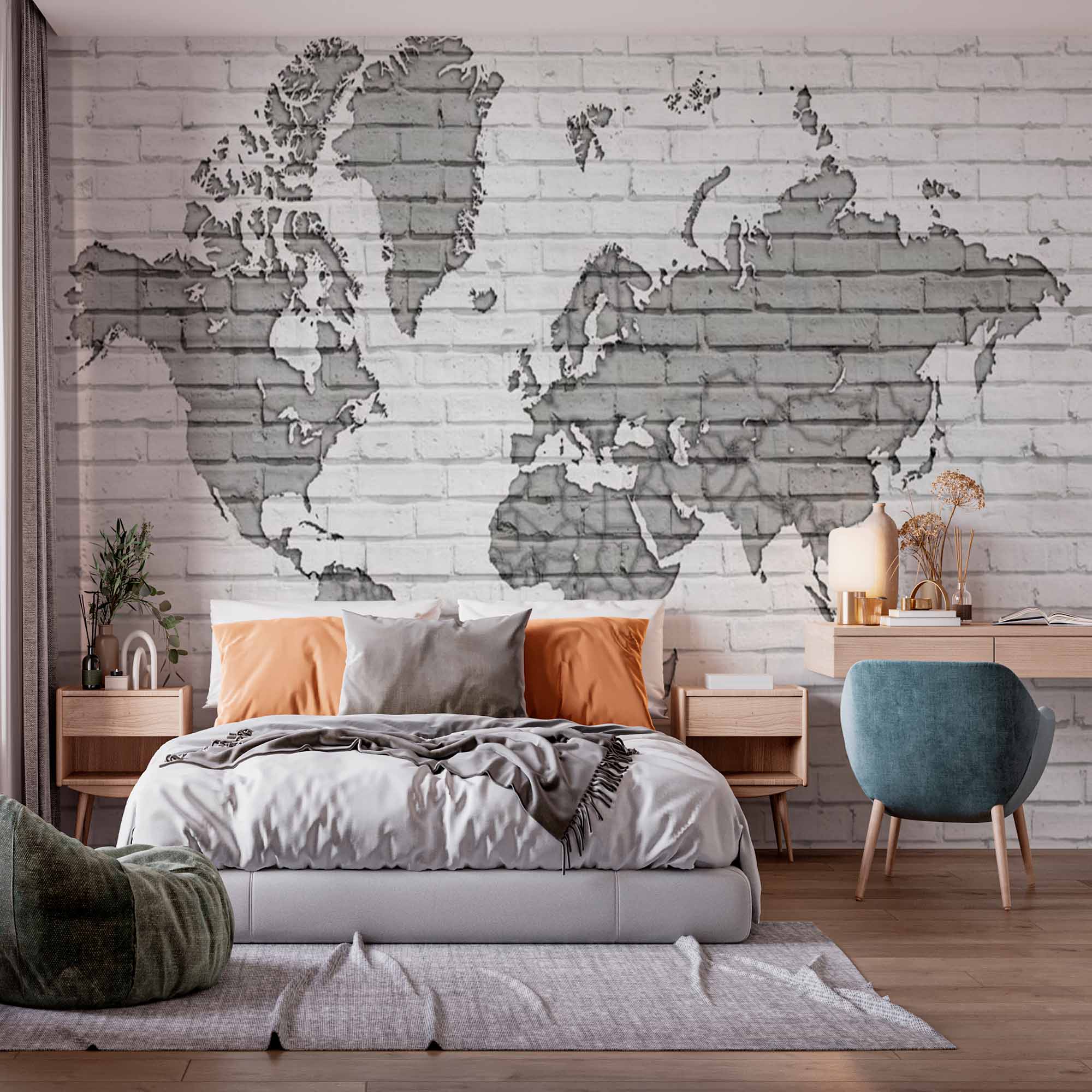 Nowoczesna tapeta z mapą świata na ścianie ceglanej w kolorze monochromatycznym