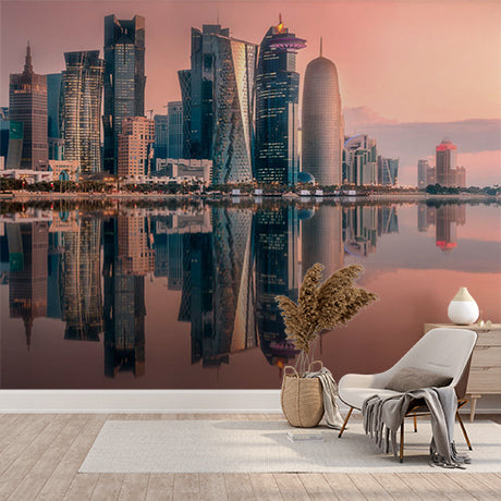 Nowoczesna panorama Doha o zachodzie słońca Naklejka - Odblaskowe drapacze chmur na wodzie