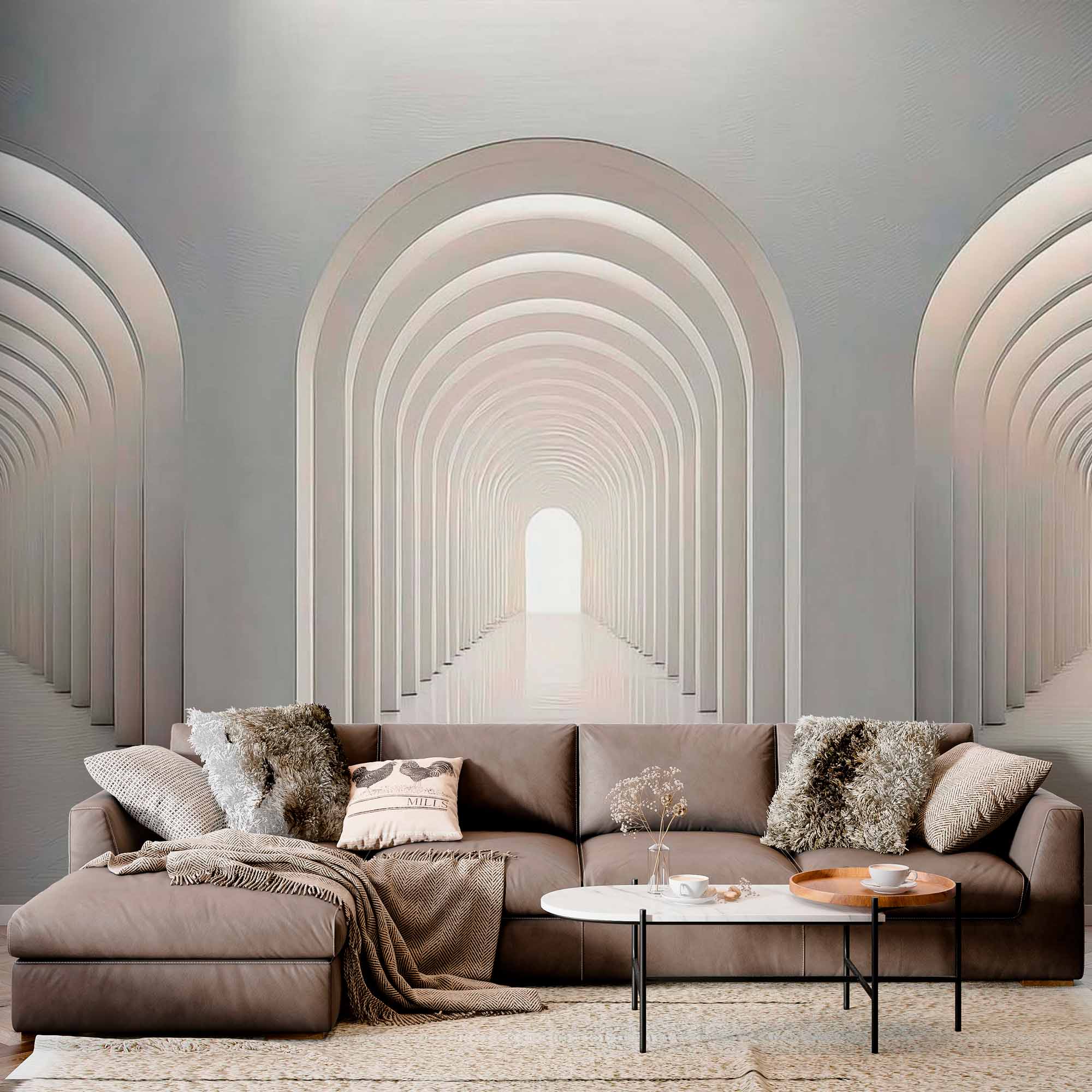 Zdjęcie przedstawia minimalistyczną i nowoczesną fototapetę z serią powtarzających się białych łuków, tworząc pozornie nieskończony efekt korytarza. Łuki są idealnie symetryczne, a światło na końcu tunelu dodaje głębi i poczucia spokojnej otwartości. Czysty, monochromatyczny design daje poczucie spokoju i przestronności, idealny do eleganckich i nowoczesnych wnętrz poszukujących ponadczasowego akcentu architektonicznego.