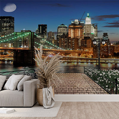 Naklejka na nabrzeże Nowego Jorku w świetle księżyca - Most Brookliński i panorama nocą