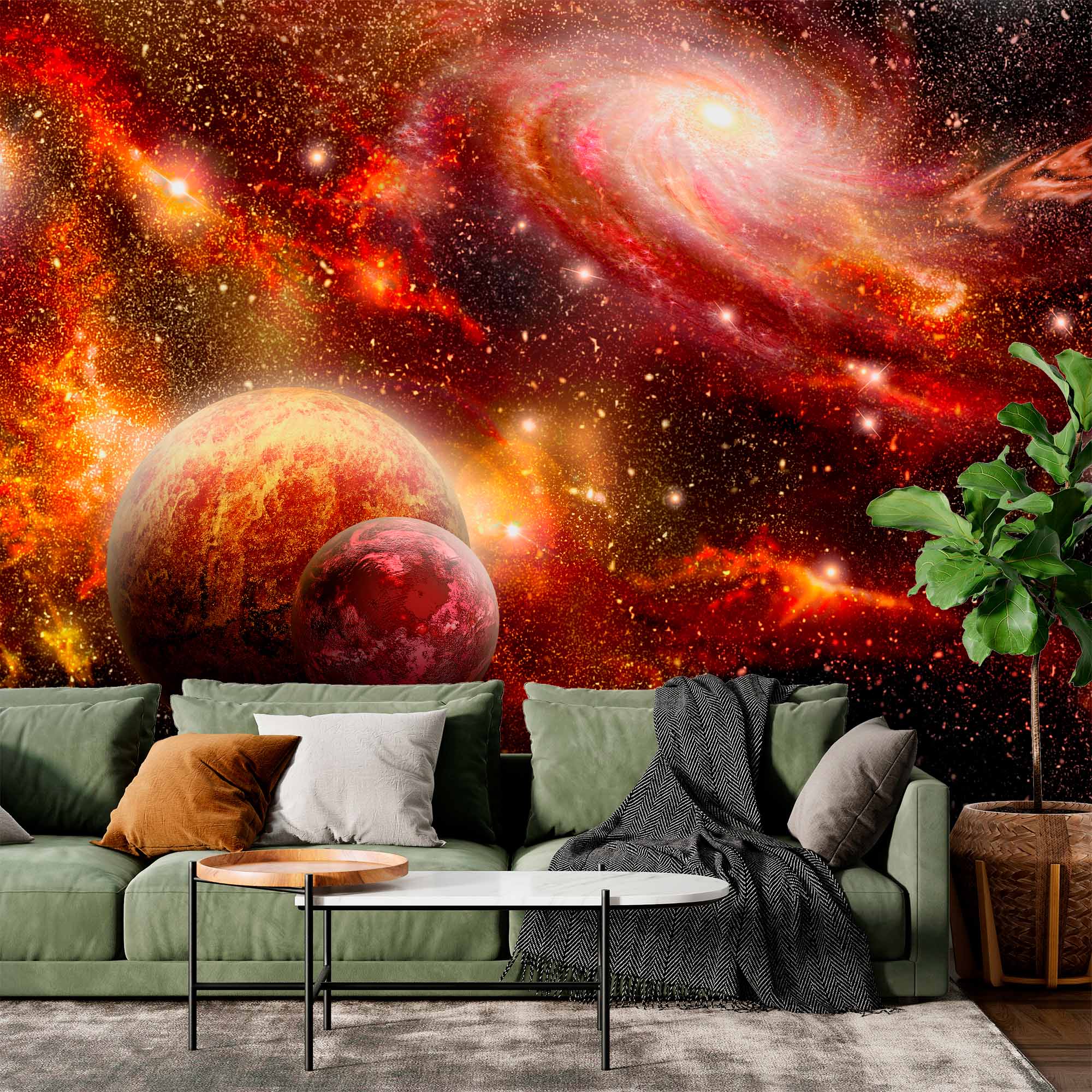 Ta fototapeta przedstawia żywą kosmiczną scenę z ognistą mgławicą, wirującymi galaktykami i dwiema obcymi planetami w bogatych odcieniach czerwieni i pomarańczy. Bezmiar przestrzeni wypełniony jest niezliczonymi gwiazdami i formacjami niebieskimi, tworząc wrażenie głębi i zachwytu. Ta fototapeta przenosi urzekające tajemnice wszechświata do Twojej przestrzeni, idealnie nadając się do stworzenia inspirującej i nieziemskiej atmosfery.