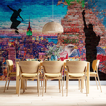 Tapeta artystyczna uliczna Nowego Jorku - miejska panorama z deskorolkarzem i symbolami patriotycznymi