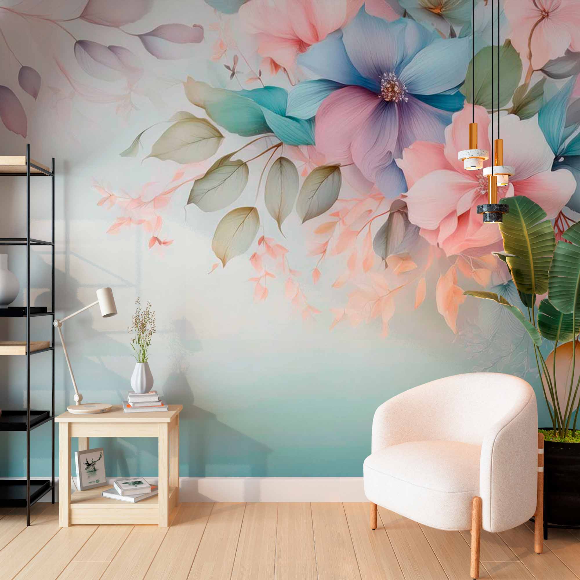 Obraz przedstawia delikatny i elegancki kwiatowy wzór z miękkimi, pastelowymi kwiatami i liśćmi. Kwiaty są przeważnie w odcieniach różu, błękitu i brzoskwini, tworząc efekt kojący i uspokajający. Liście i płatki są półprzezroczyste, co dodaje kompozycji eterycznego charakteru. Tło stanowi delikatne przejście od jasnego kremu do delikatnego turkusu, co podkreśla ogólną spokojną i pogodną atmosferę tapety. Ten projekt jest idealny do stworzenia spokojnego i estetycznego środowiska w każdej przestrzeni.