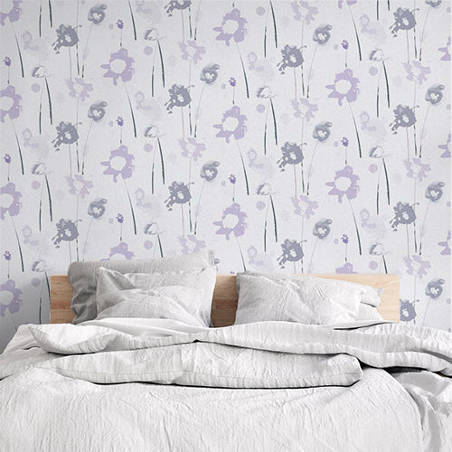 Fioletowo-szara tapeta akwarelowa z motywem kwiatowym na ścianach