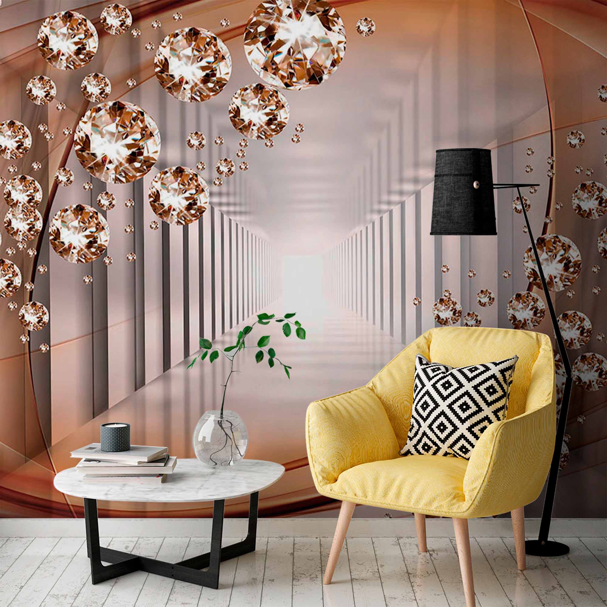 Ten obraz przedstawia efektowny wizualnie wzór tapety, który łączy w sobie iluzję długiego, odblaskowego korytarza z pływającymi, fasetowanymi kryształami. Kamienie szlachetne wydają się być zawieszone w powietrzu, przechwytując światło i tworząc błyszczące odbicia. Korytarz z delikatnym gradientem ciepłych odcieni beżu i bursztynu prowadzi wzrok w stronę jasnego, świecącego punktu końcowego, wzmacniając poczucie głębi i perspektywy. Ogólny efekt jest luksusowy i nowoczesny, co czyni go urzekającym wyborem dla wysokiej klasy, współczesnej przestrzeni.