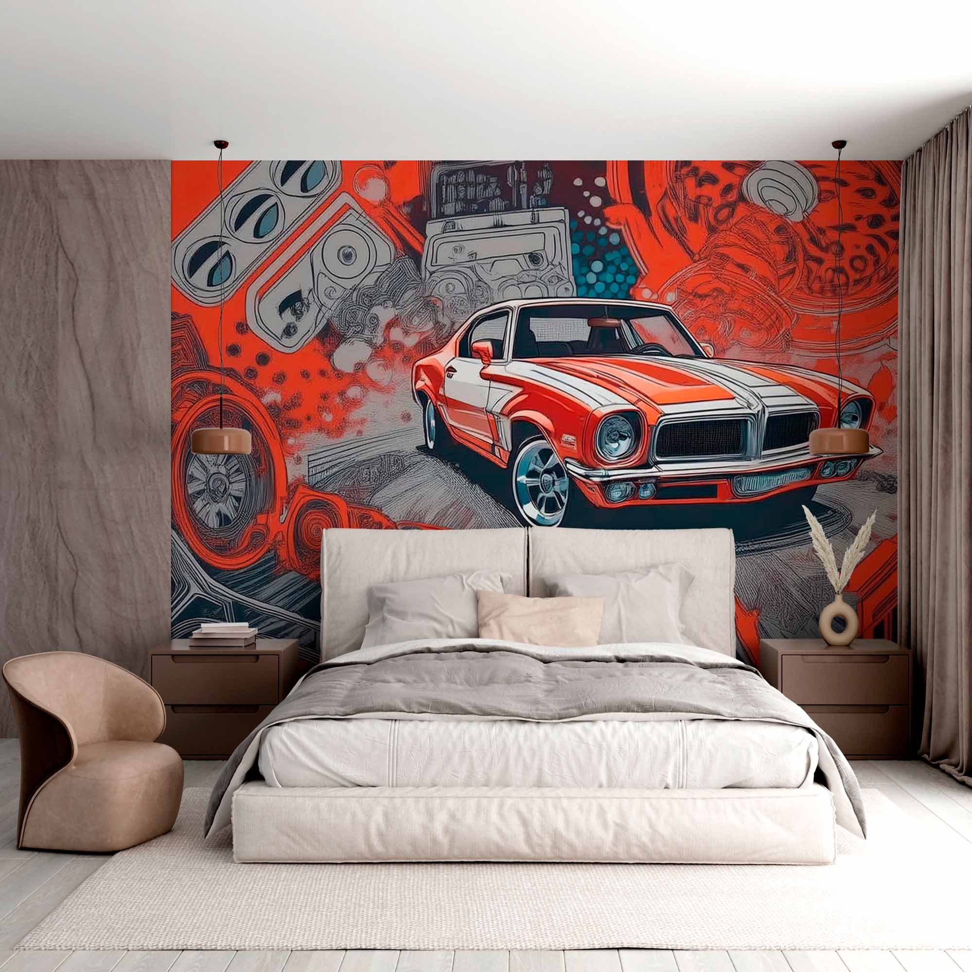 Ta tapeta przedstawia uderzającą ilustrację klasycznego samochodu typu muscle car, przedstawioną w odważnych kolorach czerwonym i białym. Samochód otoczony jest dynamicznym kolażem części samochodowych i elementów abstrakcyjnych, wywołujących poczucie prędkości i mocy. Projekt inspirowany stylem retro oddaje esencję kultury samochodów zabytkowych dzięki szczegółowym liniom i żywej palecie kolorów, która podkreśla energię i mechaniczną złożoność sceny. Idealny dla miłośników motoryzacji i fanów klasycznej sztuki motoryzacyjnej