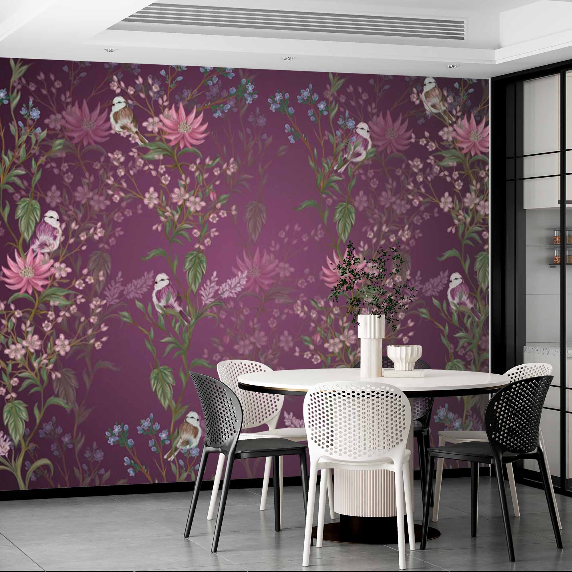 Tapeta ścienna z bogatymi śliwkowymi kwiatami i ptakami