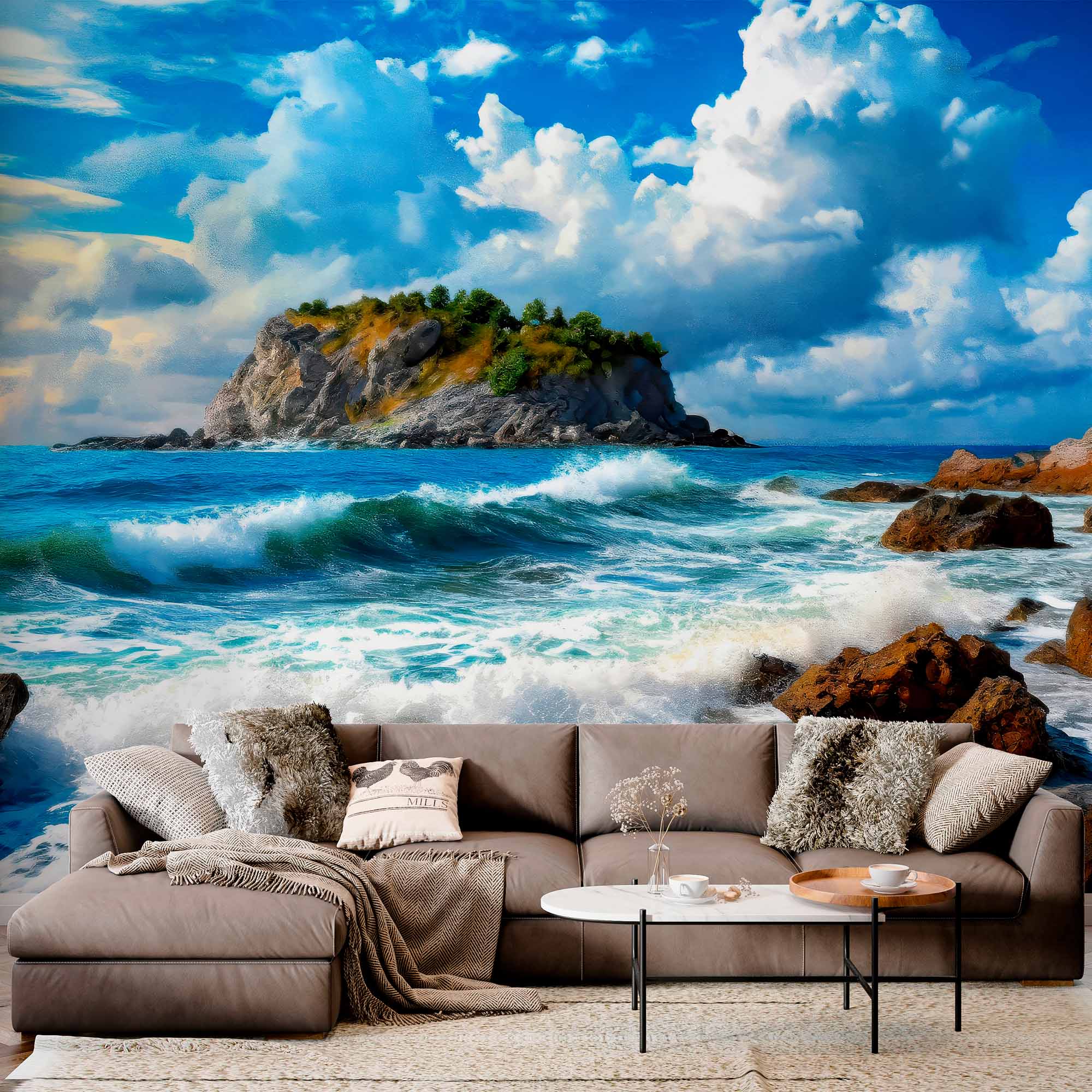 To żywe zdjęcie oddaje piękno skalistego wybrzeża z falami rozbijającymi się o kamienie. W tle bujna, zielona wyspa wyłania się z turkusowo-niebieskiego oceanu, otoczona niebem wypełnionym dramatycznymi chmurami. Scena ta oddaje surową moc i spokojne piękno natury, co czyni ją idealną tapetą dla miłośników nadmorskich krajobrazów i uroku oceanu.