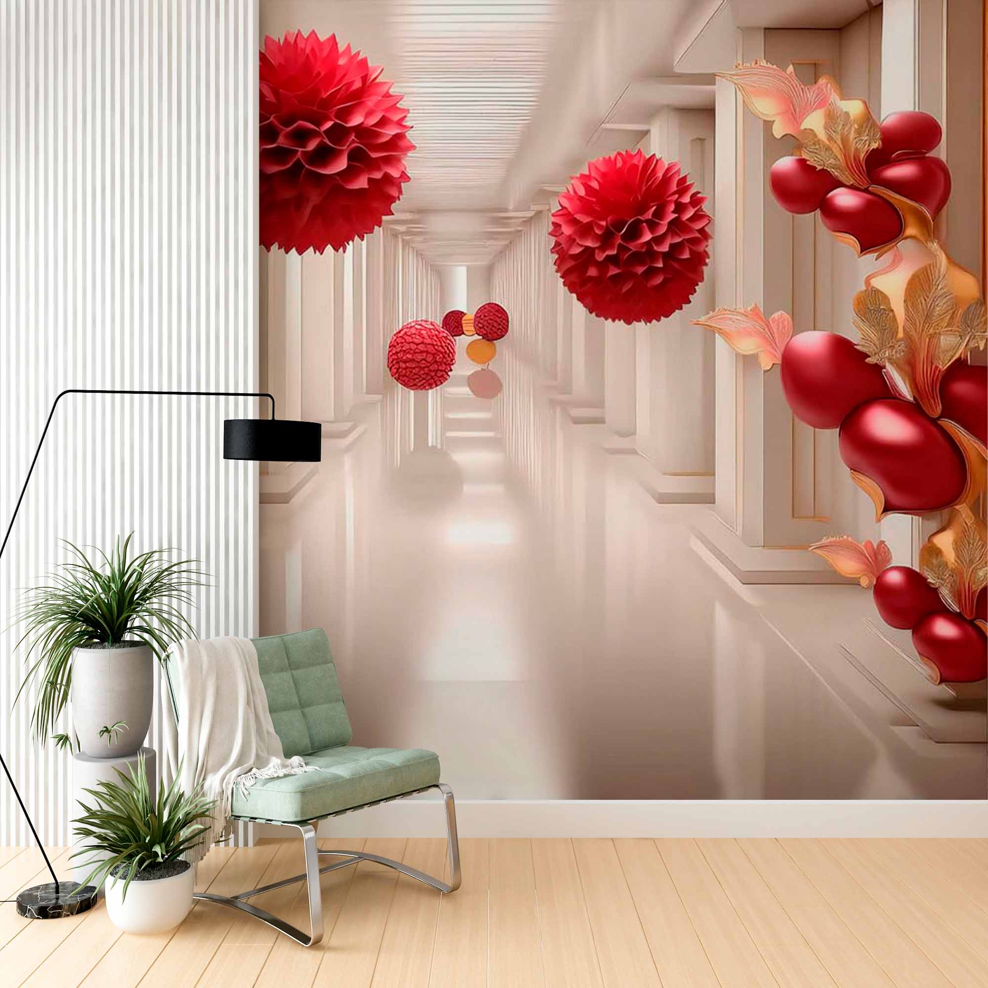 Zdjęcie przedstawia luksusową fototapetę przedstawiającą wielki korytarz złożony z eleganckich, kremowych kolumn. Żywe czerwone rzeźby kwiatowe i kuliste ozdoby unoszą się po korytarzu, otoczone misternymi złotymi akcentami na liściach i kwiatach. Odbicie na błyszczącej podłodze dodaje głębi, tworząc surrealistyczną i elegancką atmosferę. Ta fototapeta idealnie nadaje się do wprowadzenia poczucia bogactwa i nowoczesnego wyrafinowania do wnętrz.