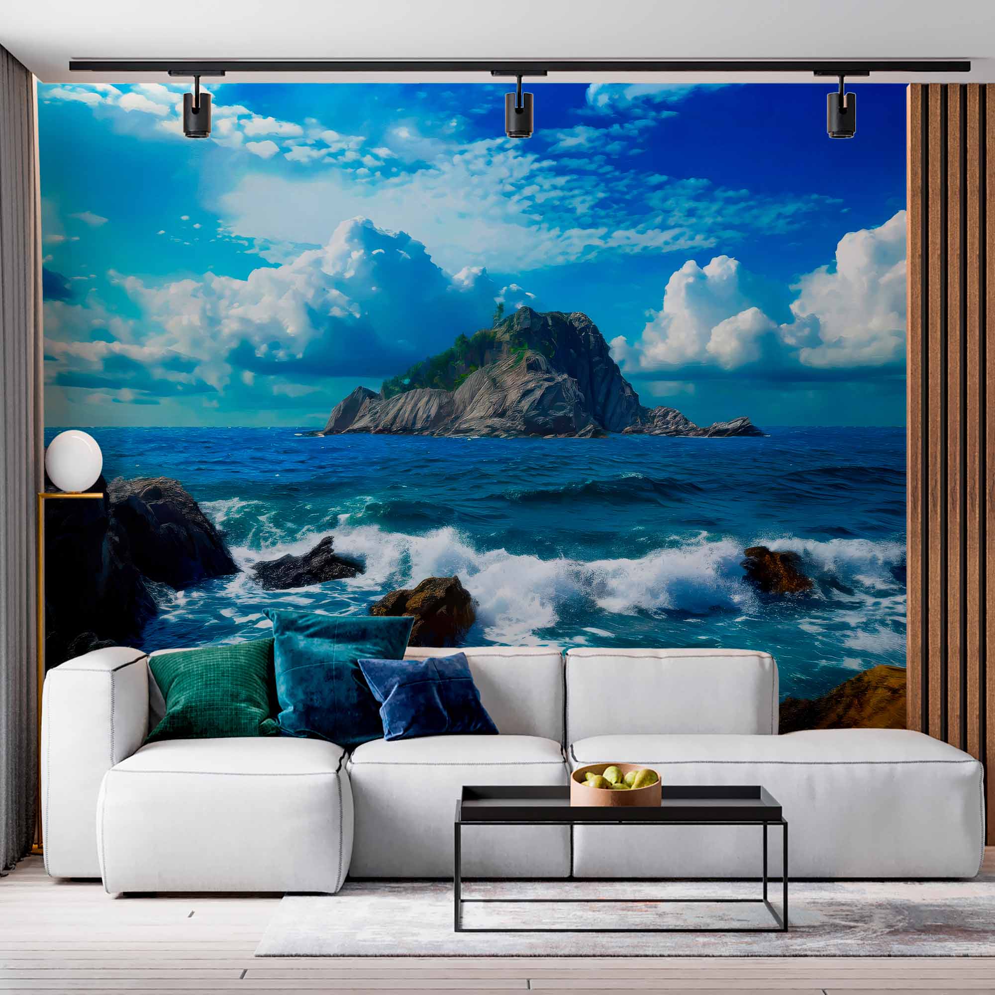 Zdjęcie przedstawia nierówną, skalistą wyspę otoczoną ciemnoniebieskim oceanem. Fale rozbijają się o skały na pierwszym planie, tworząc dynamiczną i energetyczną scenę. Powyżej niebo jest jasne, a duże, kłębiące się białe chmury kontrastują z żywym błękitem. Sama wyspa pokryta jest plamami zieleni, co nadaje jej poczucie nietkniętej przyrody. Obraz emanuje poczuciem izolacji i spokoju, co czyni go idealną tapetą dla tych, którzy cenią sobie surowe piękno oceanu i jego odległych krajobrazów.