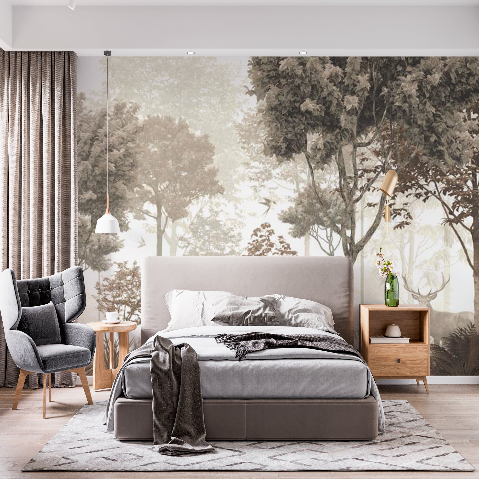 Tapeta ścienna w kolorze sepii z lasem - mglisty las z jeleniem w delikatnych odcieniach