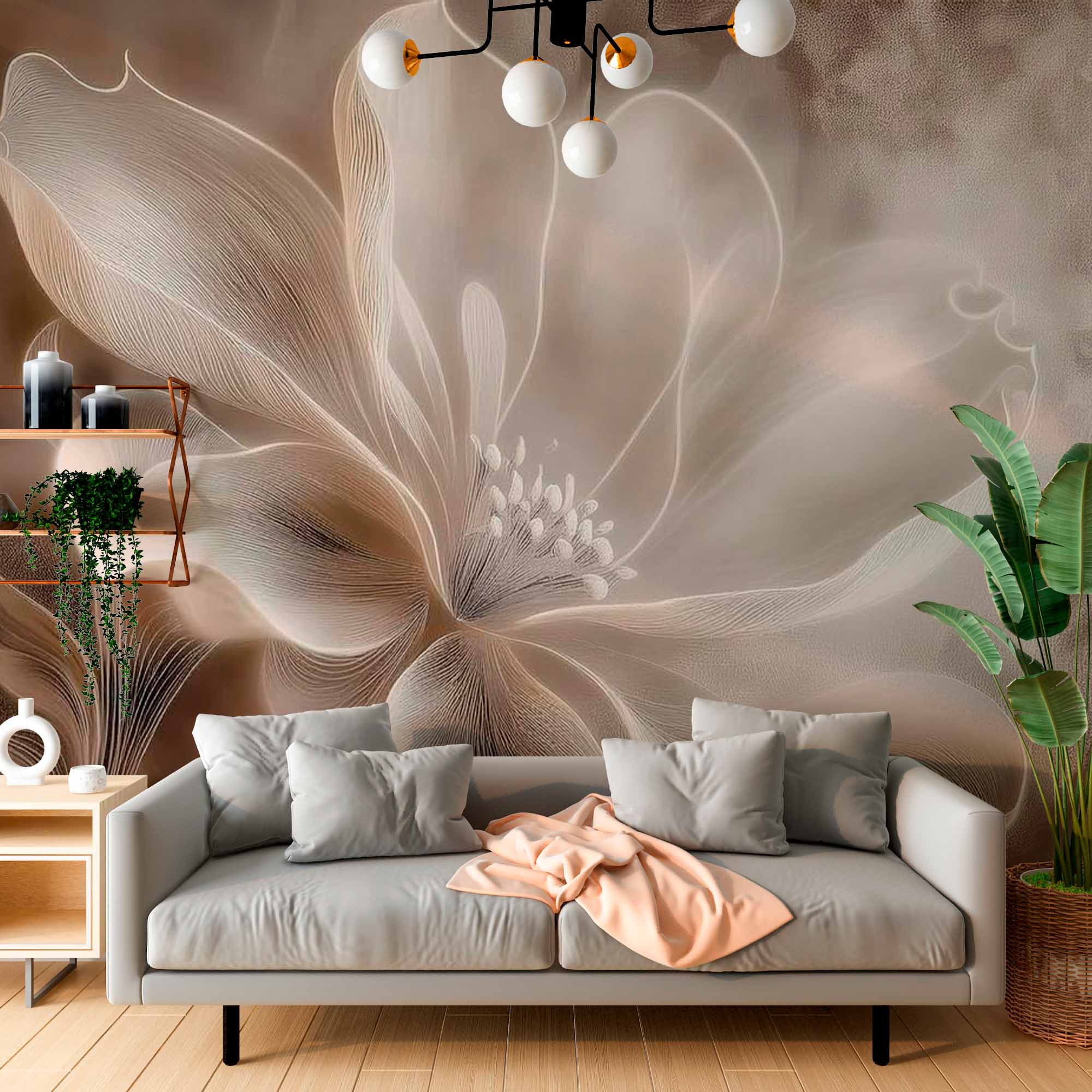 Obraz przedstawia elegancką i zwiewną tapetę z motywem kwiatowym w delikatnych, stonowanych odcieniach kości słoniowej i beżu. Kwiat, który jest w centrum uwagi, został przedstawiony delikatnymi, płynnymi liniami, które tworzą wrażenie lekkości i wdzięku. Płatki są duże i delikatnie zakrzywione, prawie przezroczyste, co nadaje kwiatowi świecącą, niemal świetlistą jakość. Tło stanowi miękka mieszanka ciepłego beżu i kremu, wzmacniająca ogólny efekt spokoju i uspokojenia. Projekt emanuje poczuciem dyskretnego luksusu i wniesie odrobinę wyrafinowanej elegancji do każdej przestrzeni, dzięki czemu idealnie nadaje się do stworzenia spokojnej i zachęcającej atmosfery.