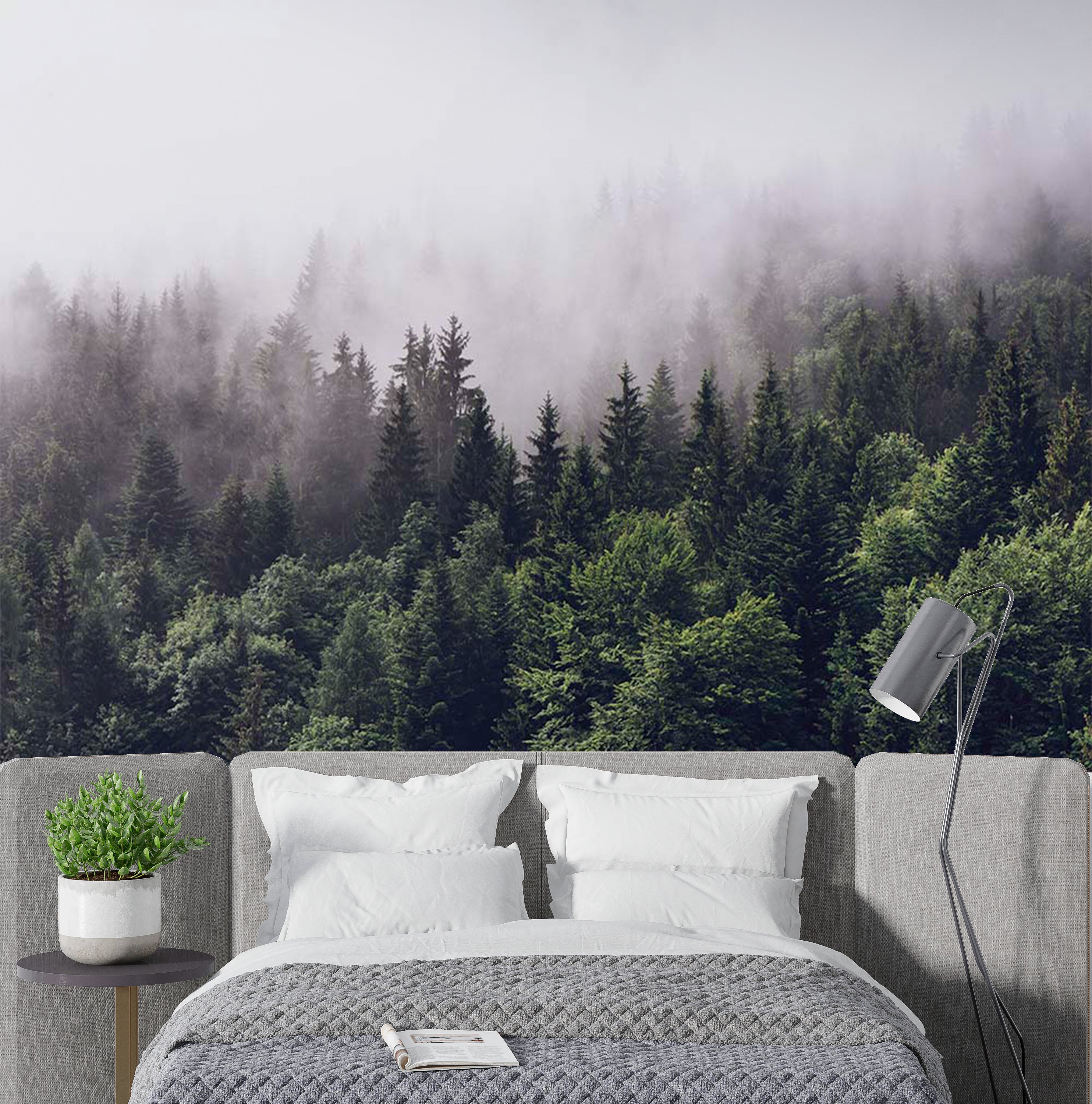 This nature wallpaper features a misty forest landscape with tall evergreen trees shrouded in fog. The soft, muted colors and misty atmosphere create a calming and tranquil scene, perfect for creating a peaceful ambiance in any room.