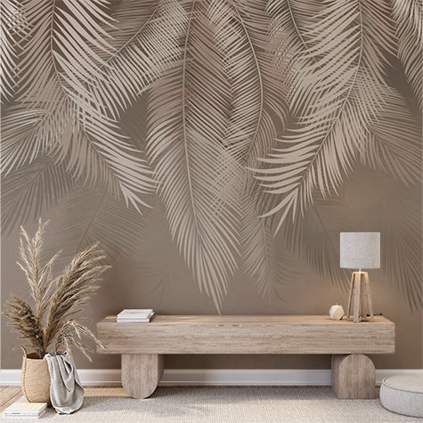 Elevate your space with this modern abstract wallpaper in soft pastel tones. This stunning wall mural features a captivating design of overlapping palm leaves, creating a sense of depth and tranquillity. The neutral color palette adds a touch of sophistication and versatility to any room.